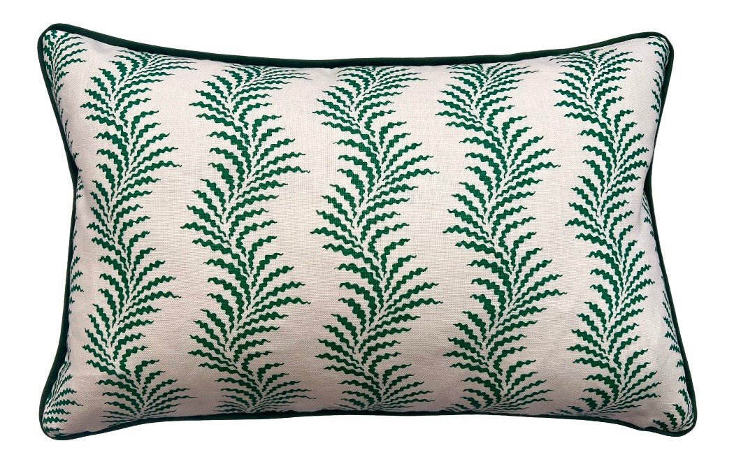 Cushions in Soane Scrolling Fern Silhouette, Emerald on ivory linen