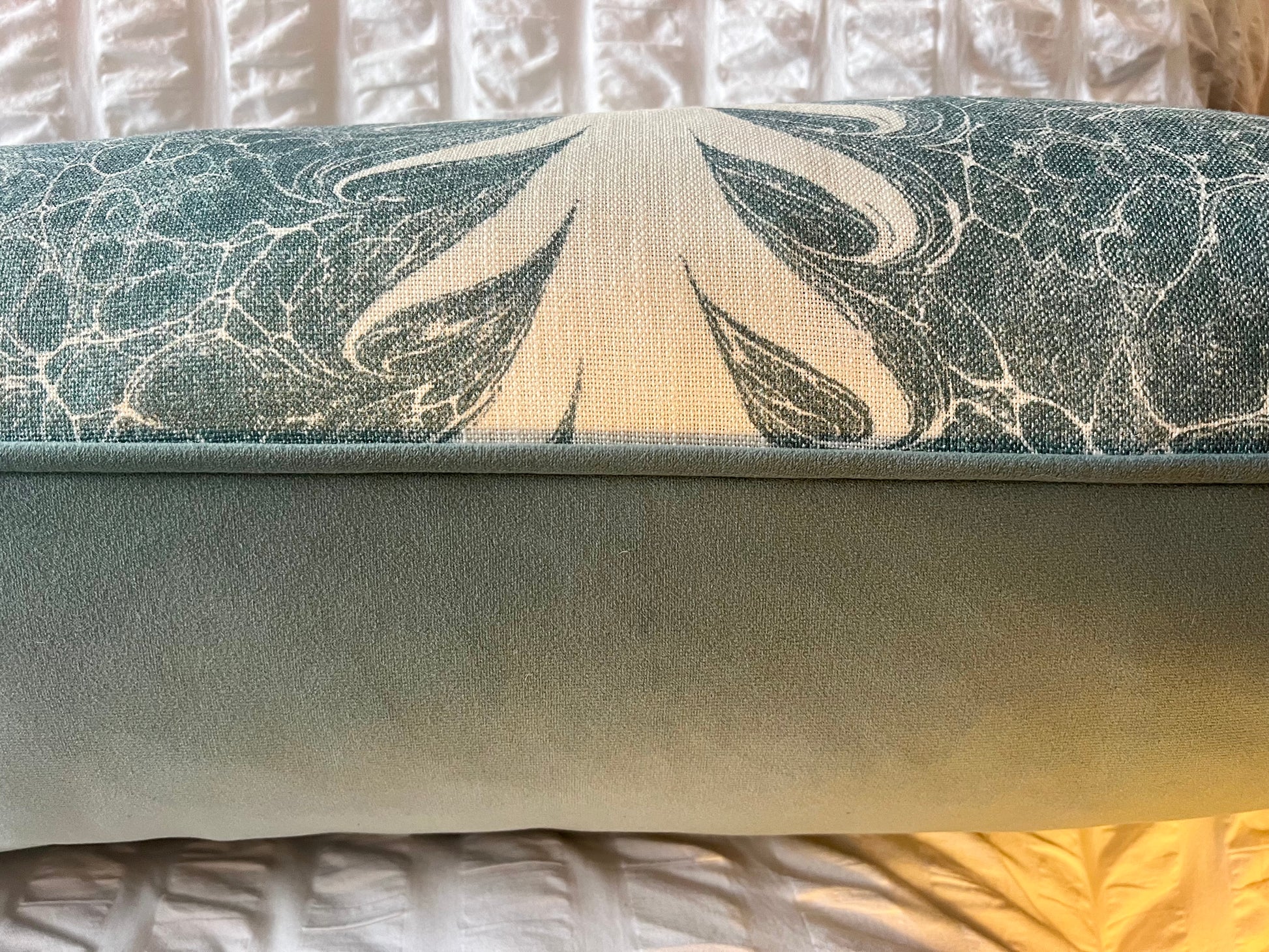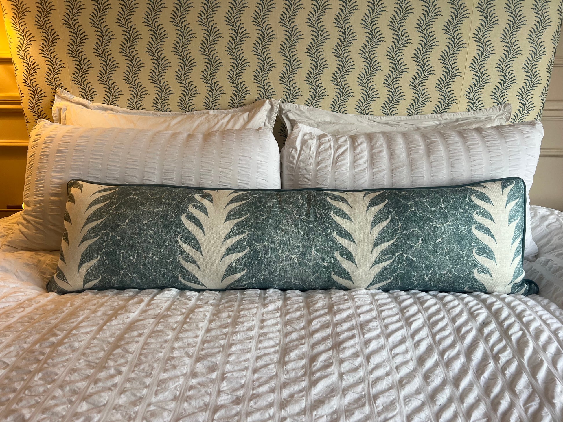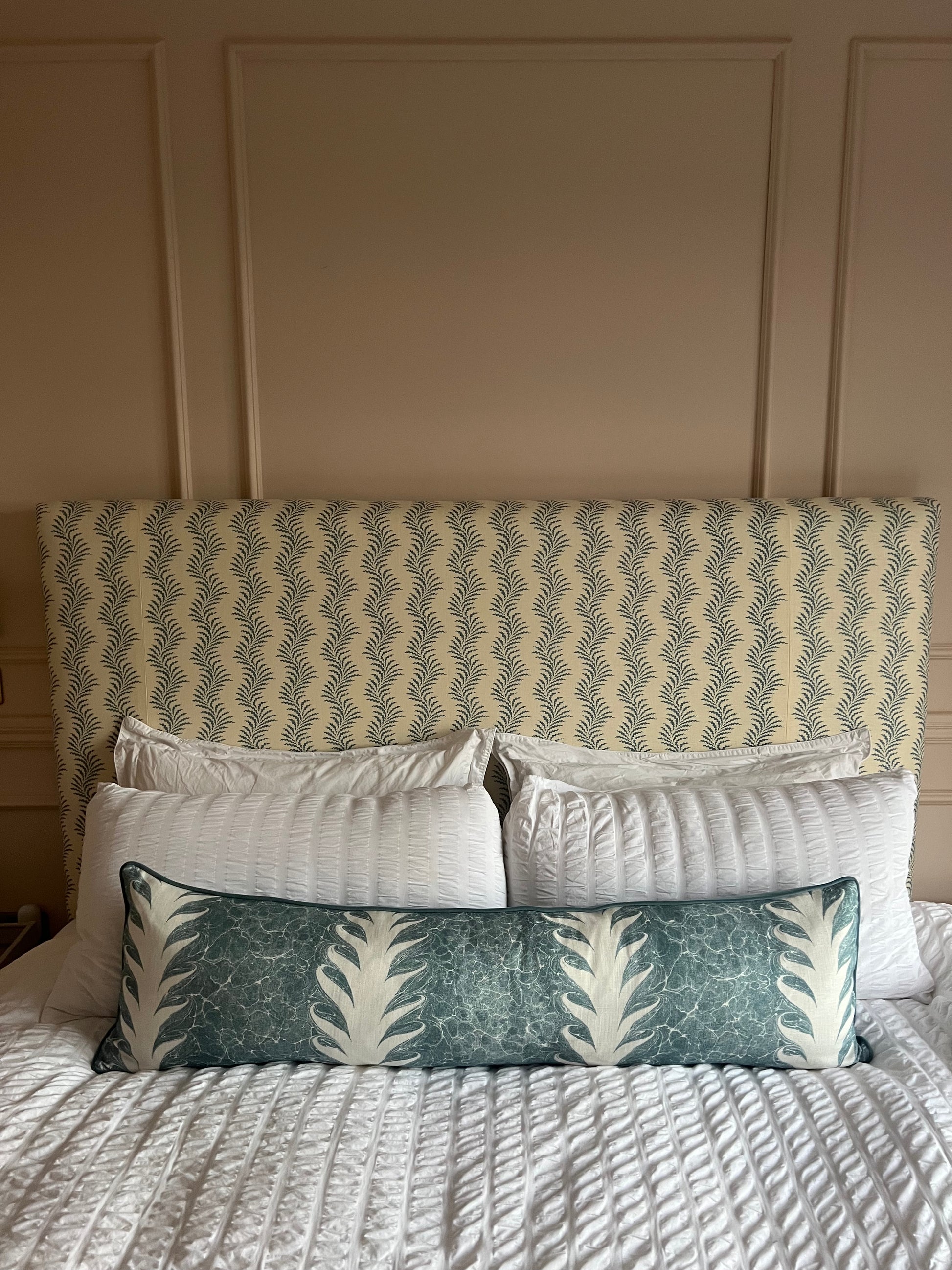 Cushions in Beata Heuman’s Palm Drop fabric. Sky Blue / Plaster colourway with airforce blue velvet piping and back.