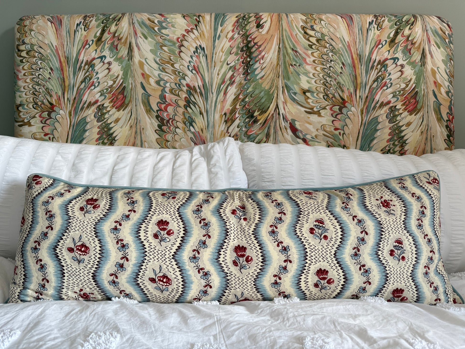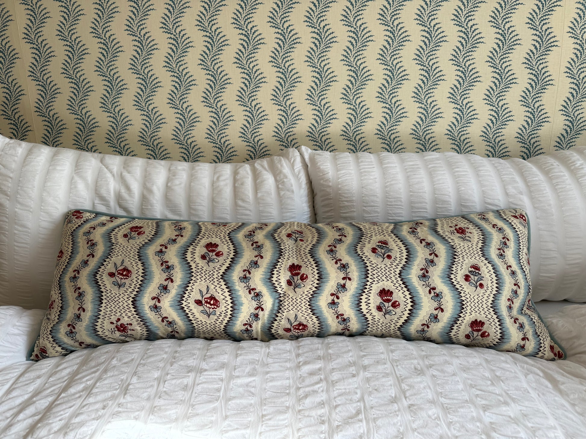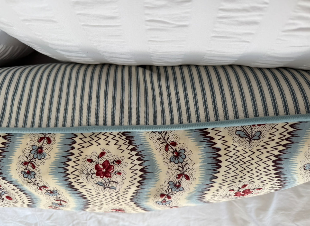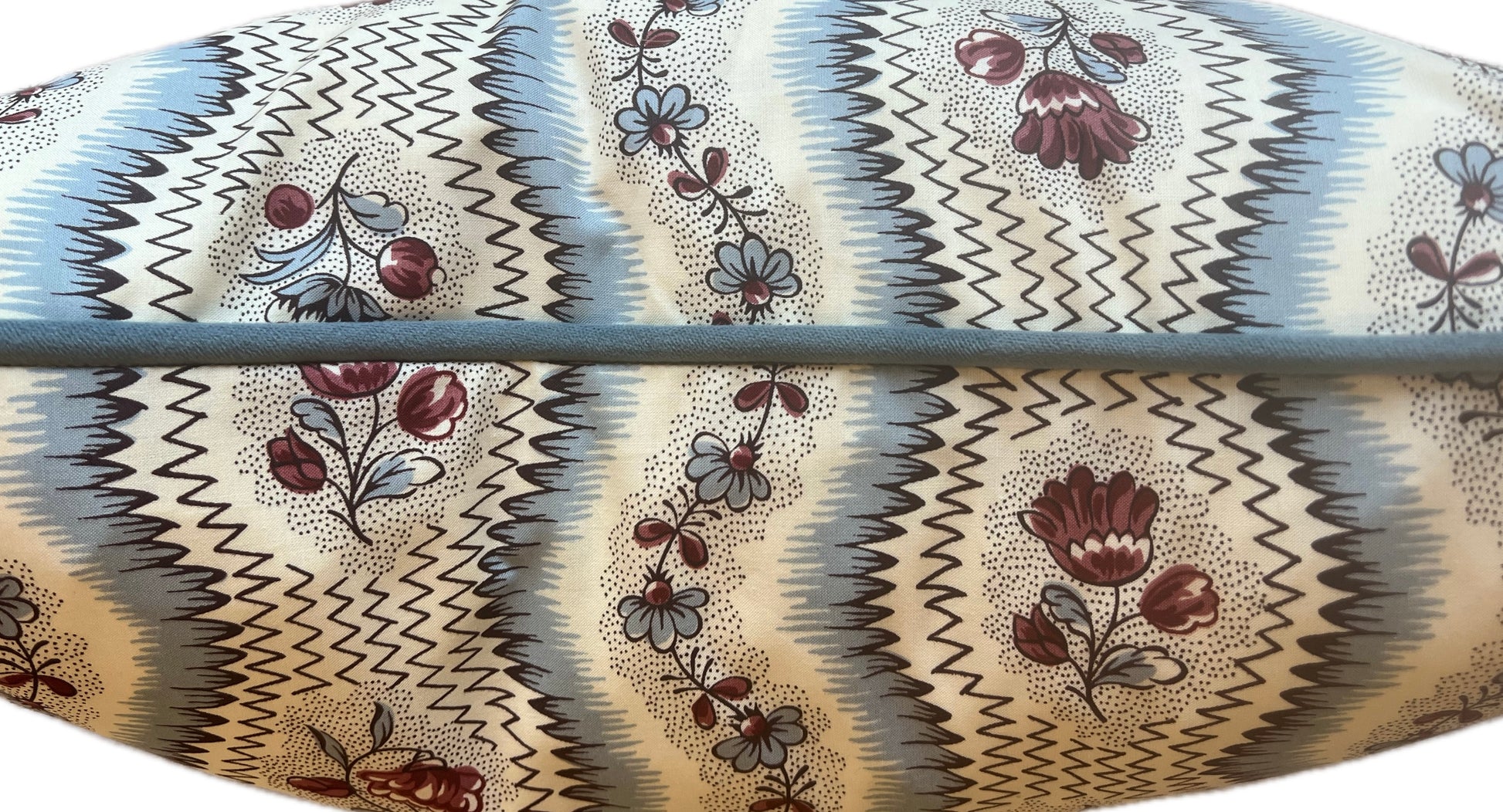 Cushion in Pierre Frey Le Manach fabric. Bleu Rouge colourway with a choice of trims and fabrics for the back. If you would prefer blue linen to blue velvet please drop me a message