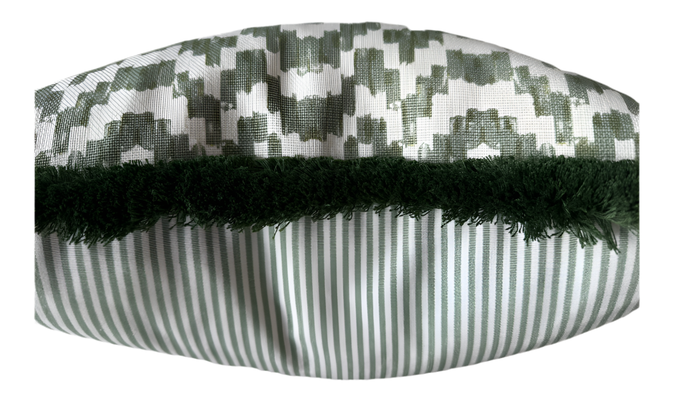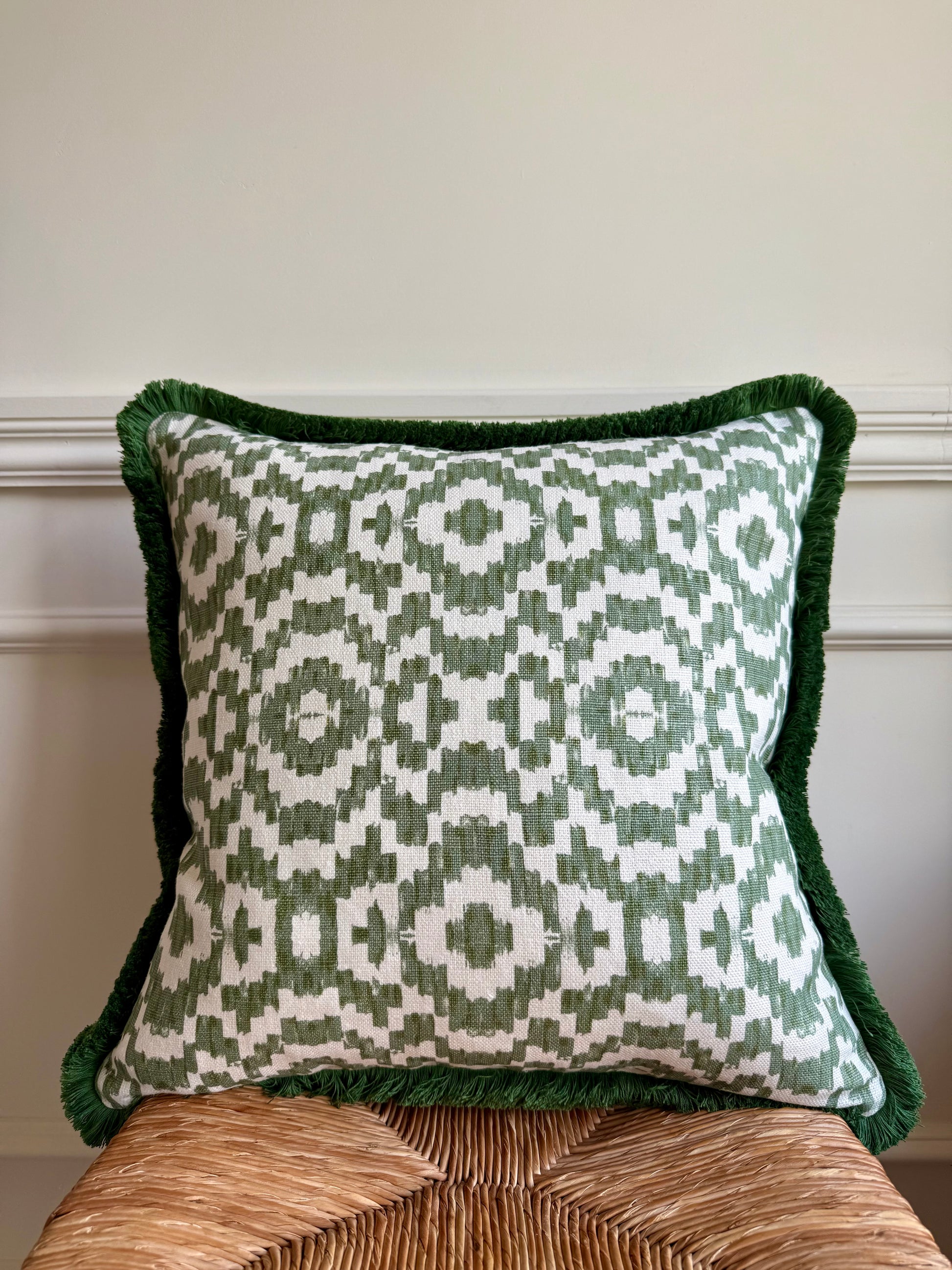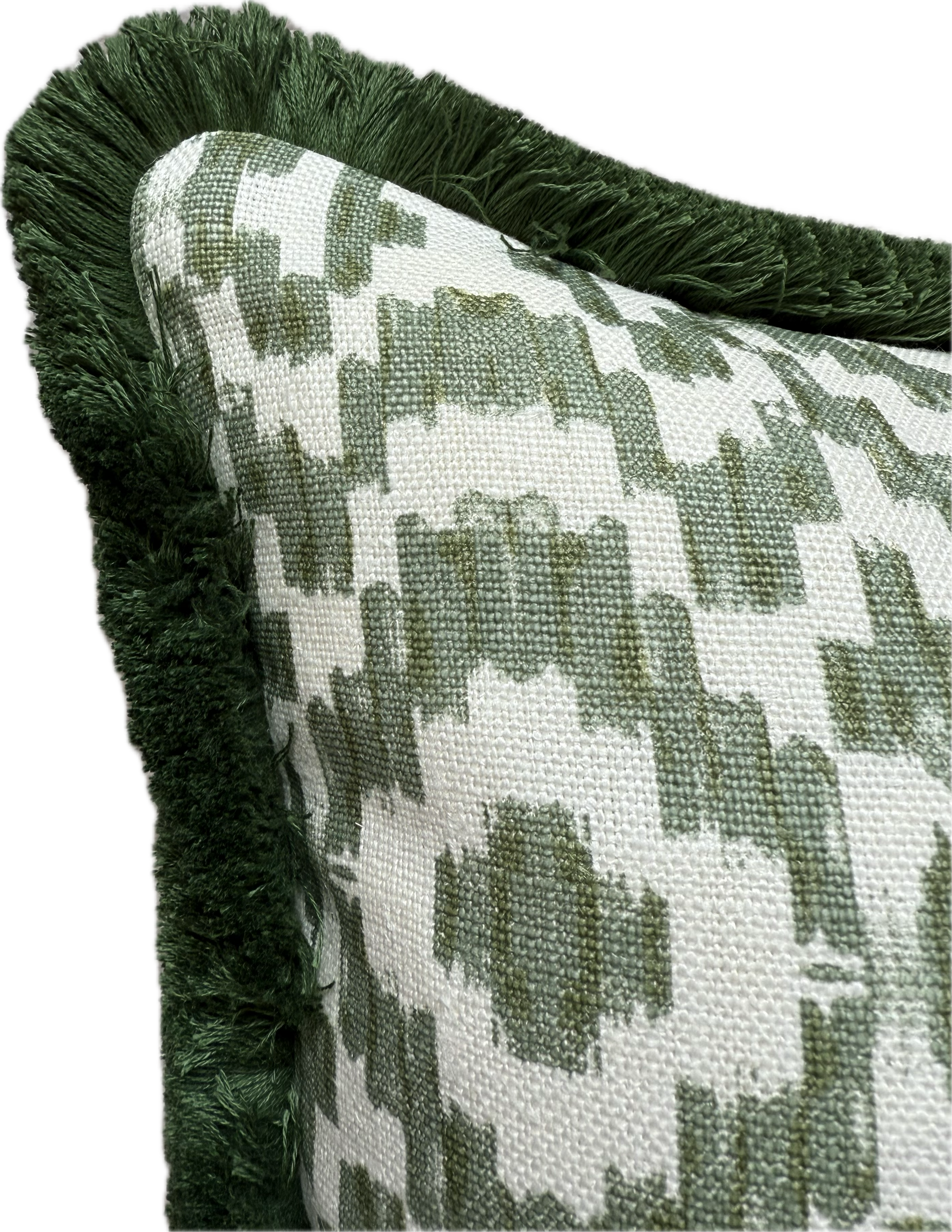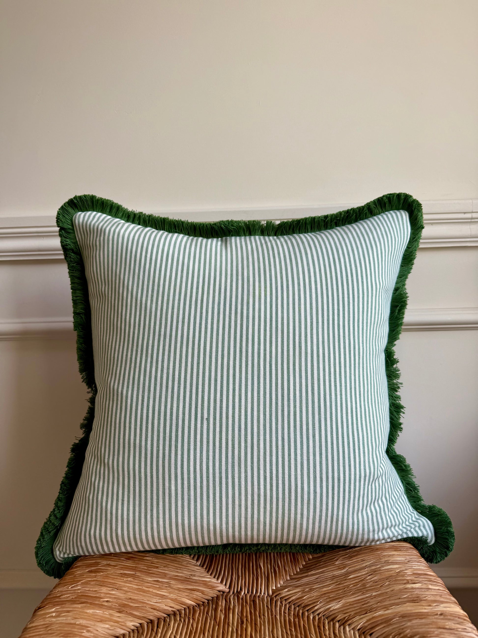 Cushions in Christopher Farr Echo fabric. Olive colourway with a soft, thick green fringe. The back is a green ticking stripe by Romo