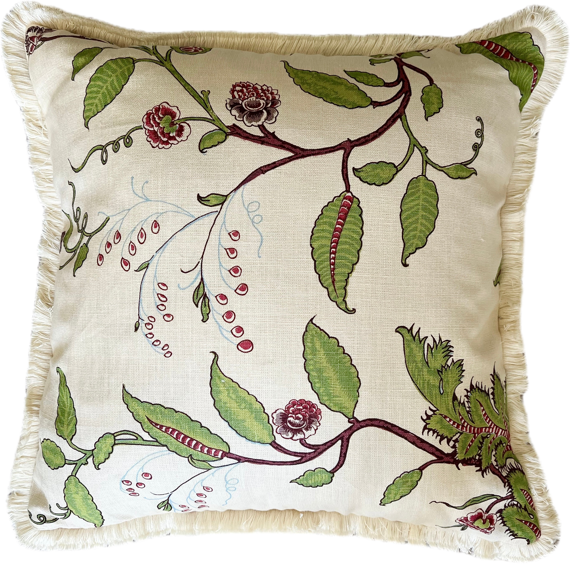 Cushions in Soane Tendril Vine fabric. Apple and Plum colourway with a cream brush fringe and cream linen back