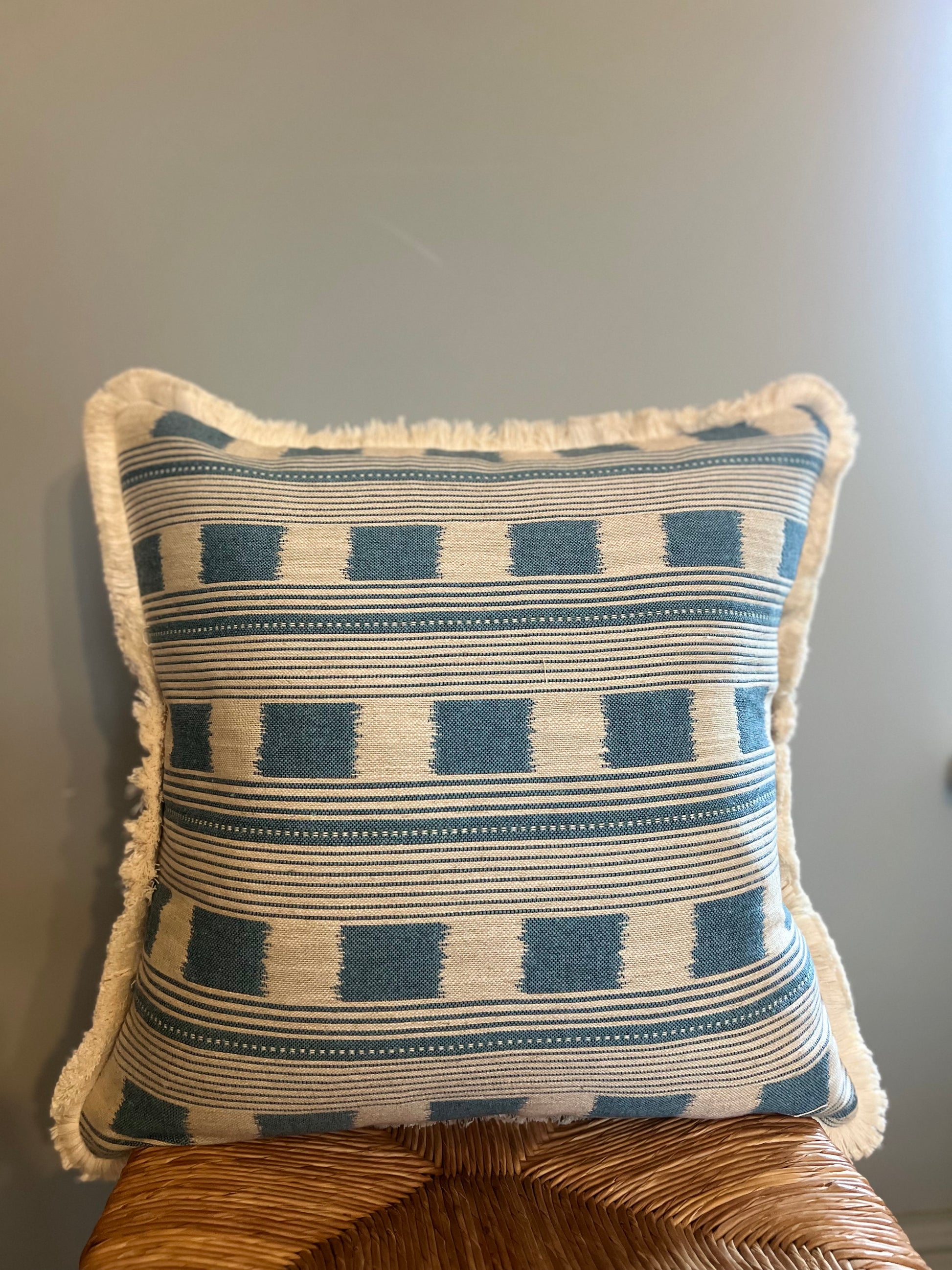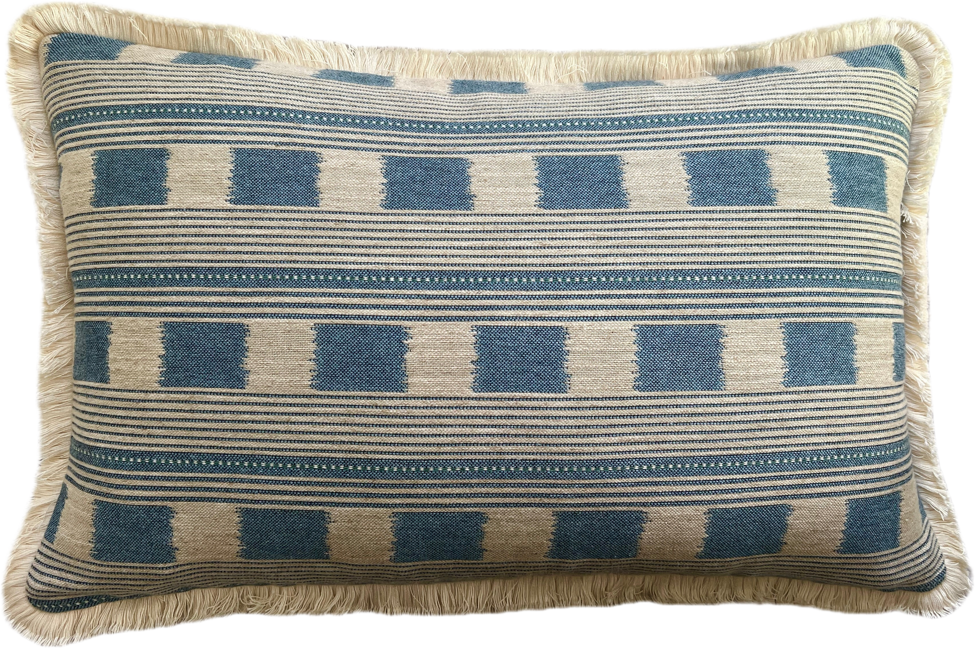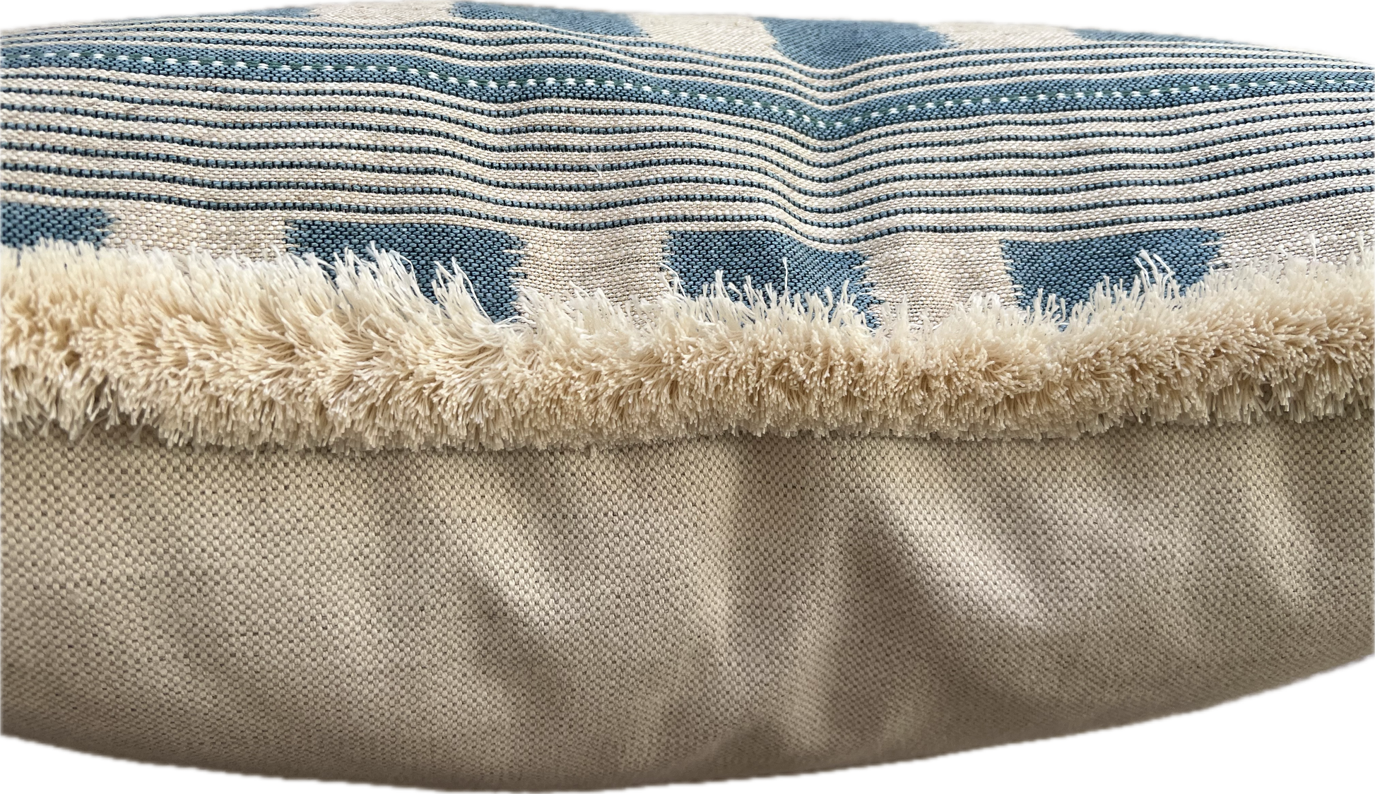 Cushions in Kit Kemp for Christopher Farr Lost and Found Fabric. Denim colourway with a cream brush fringe and cream linen back