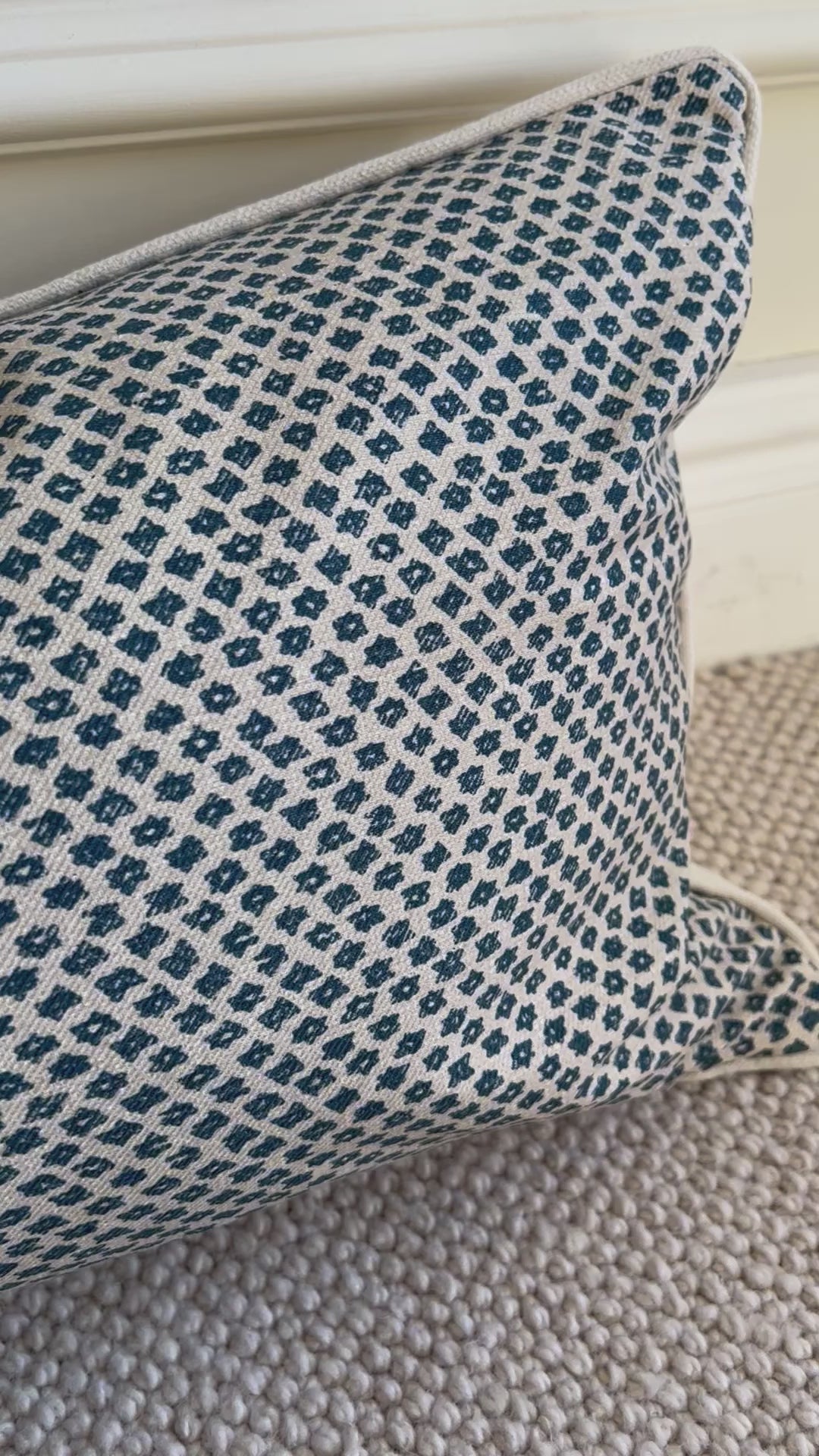 Cushion in Fermoie blue Marden fabric with cream Romo Linara piping and back