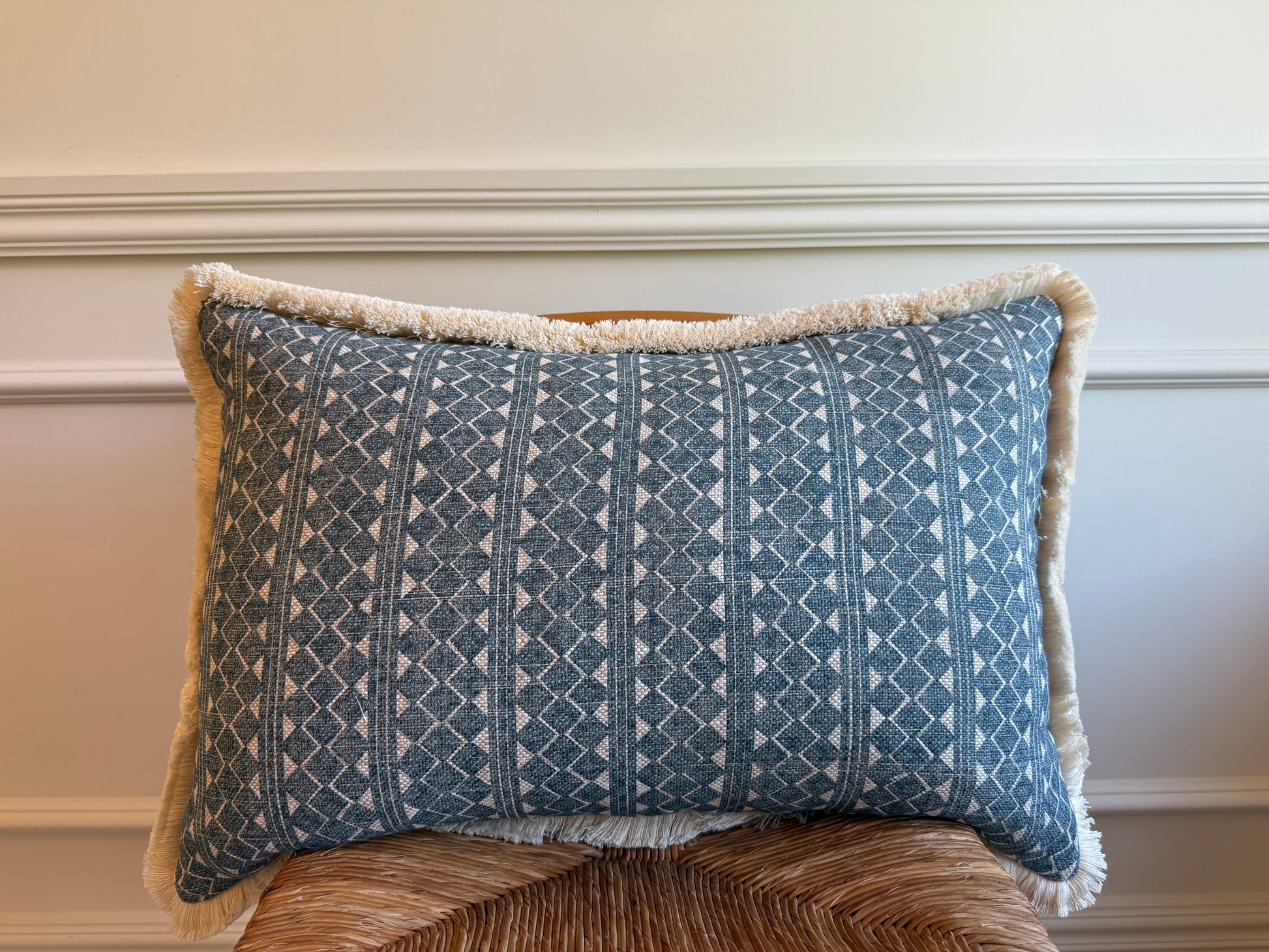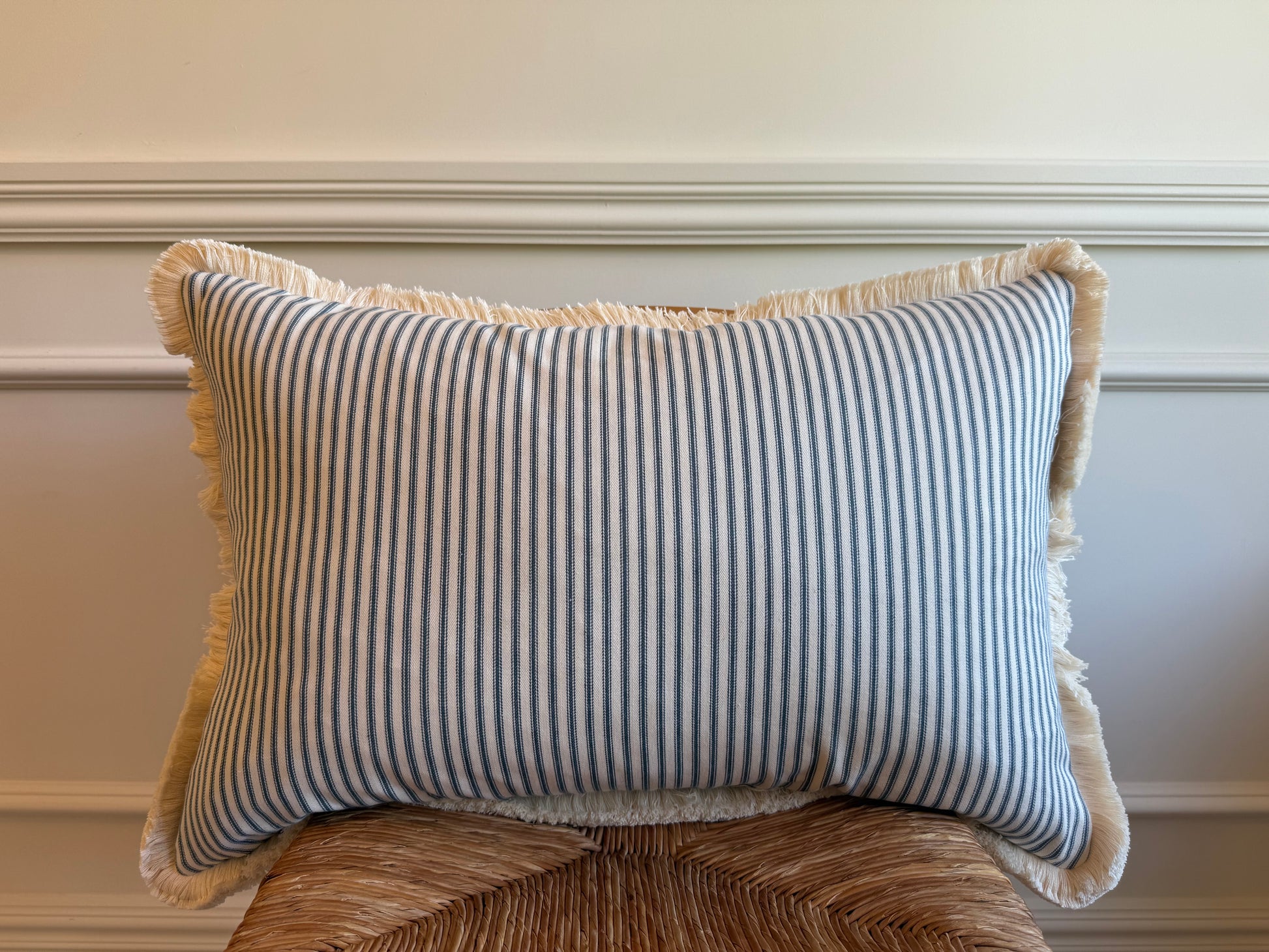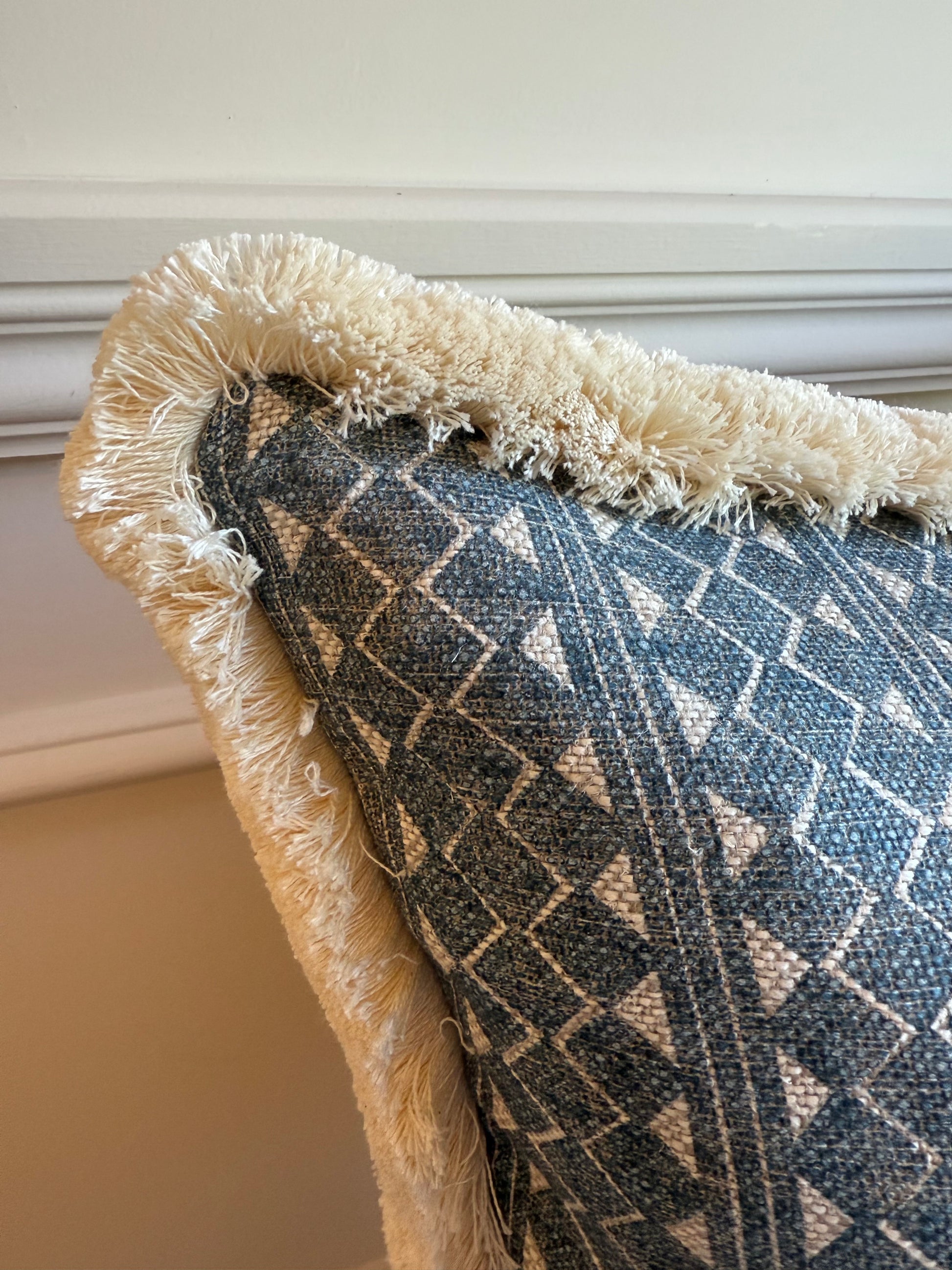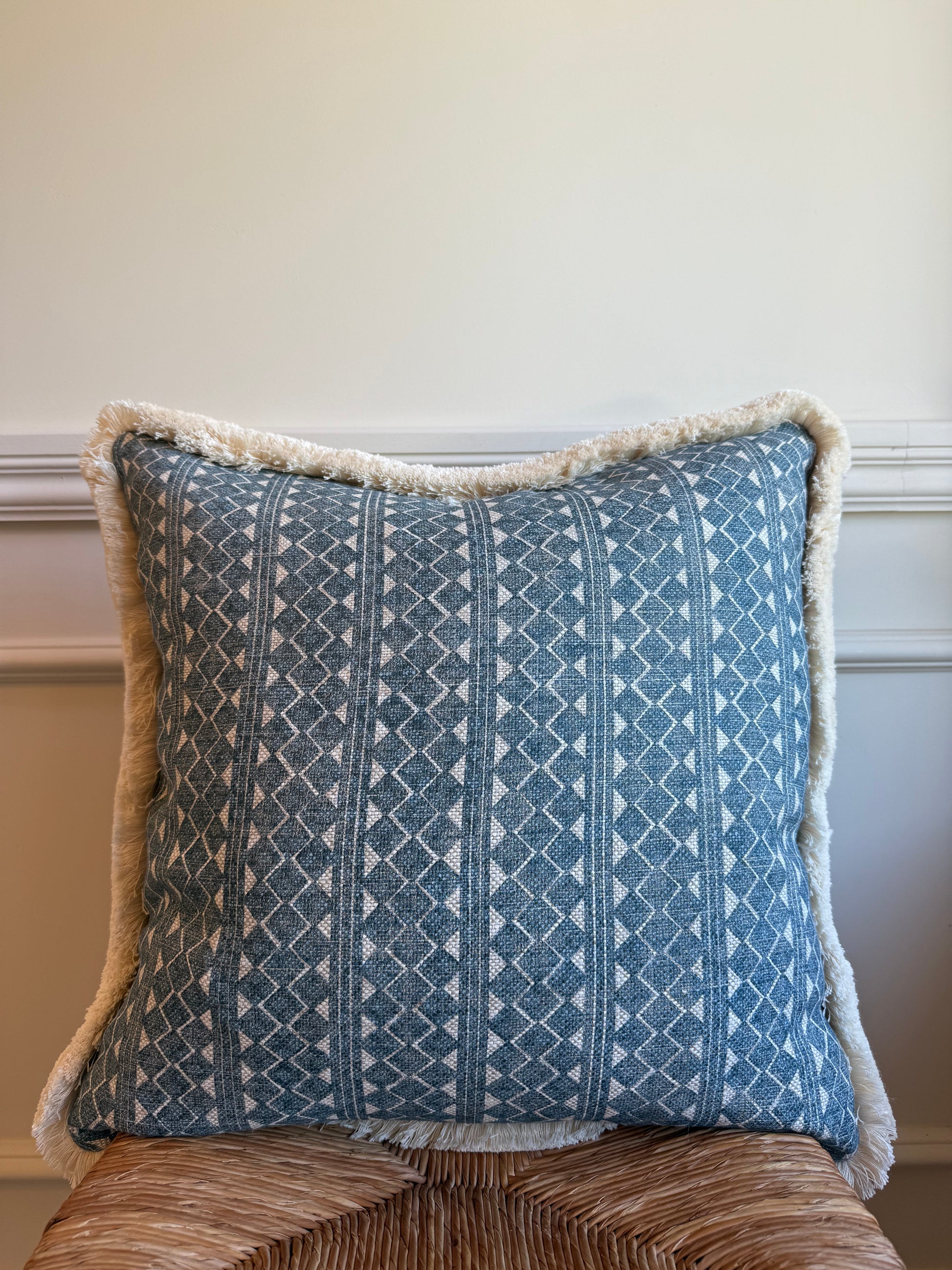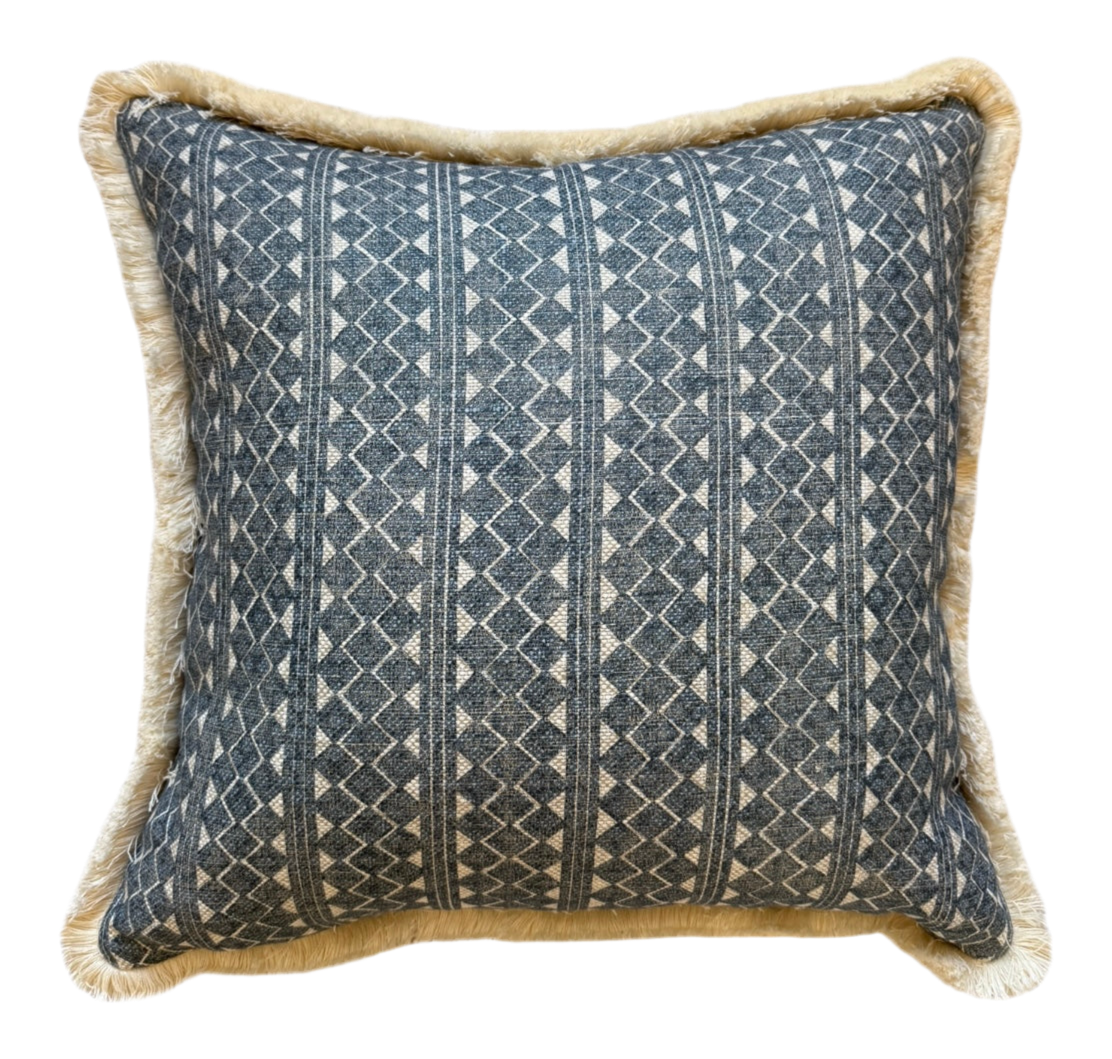 Cushions in Fermoie Quantock 015 fabric. Blie colourway with cream brush fringe and blue stripe back with concealed zip