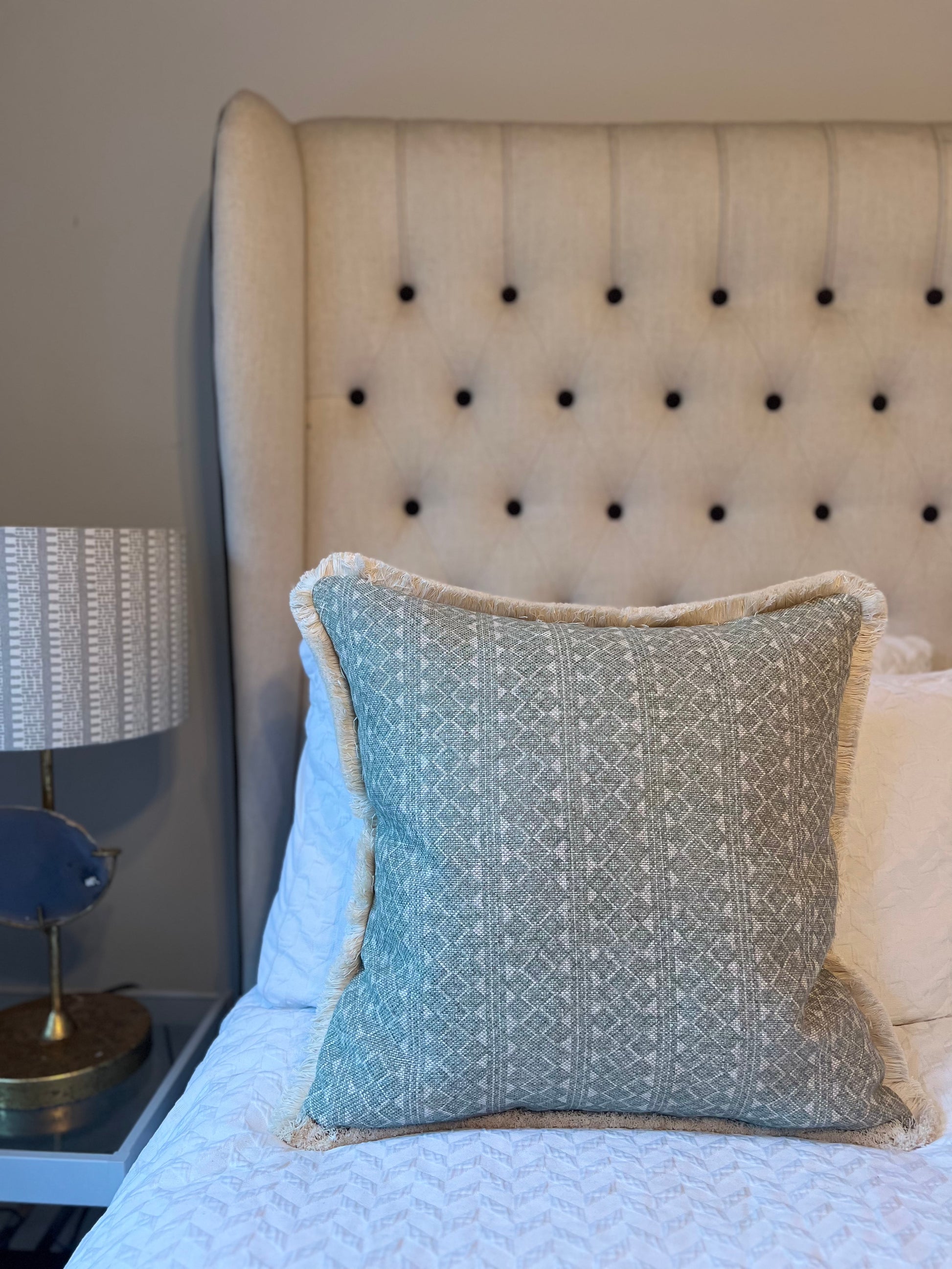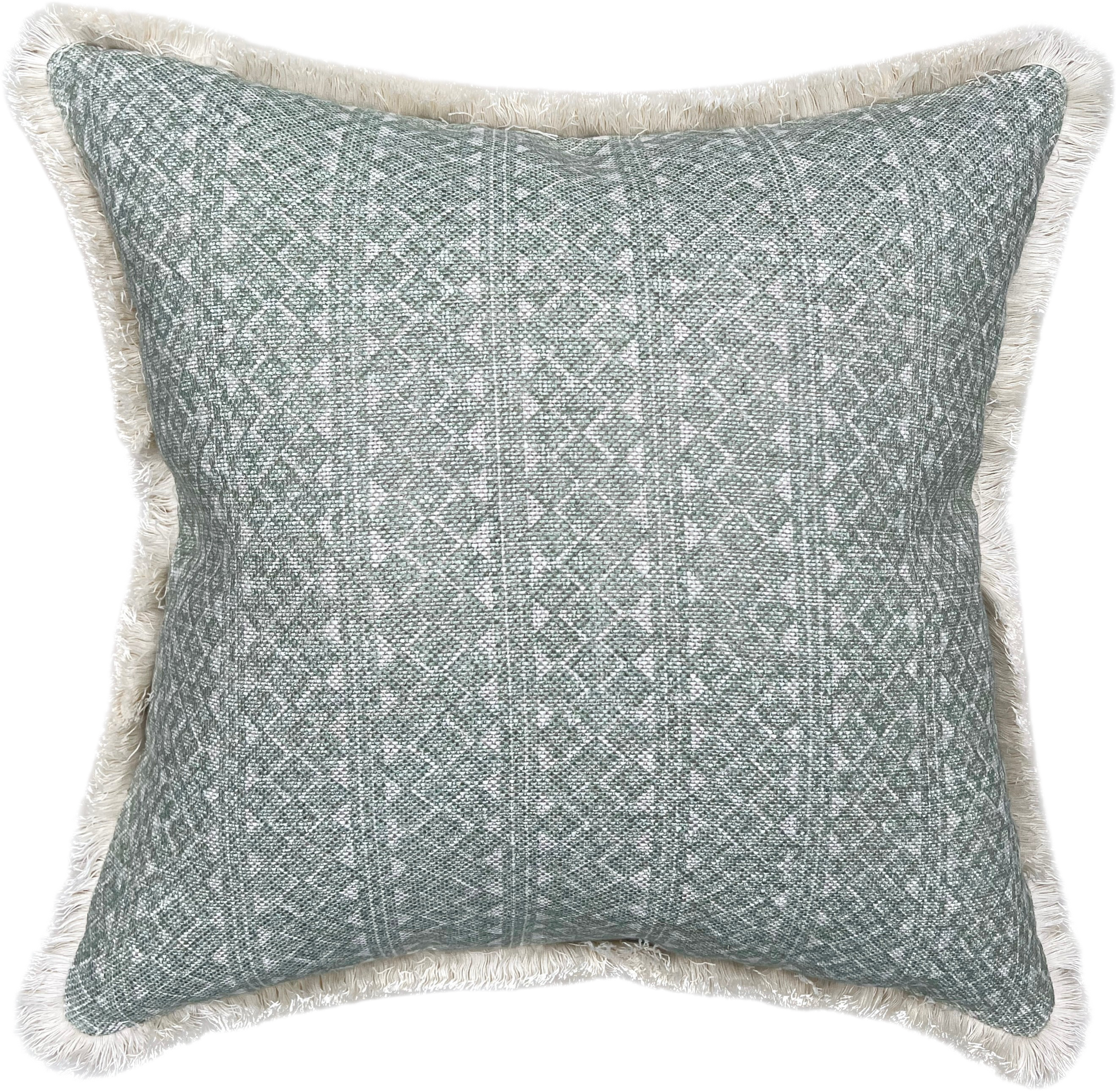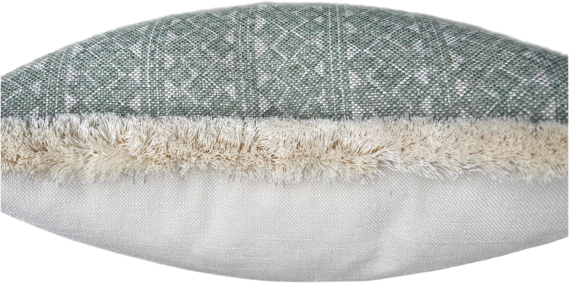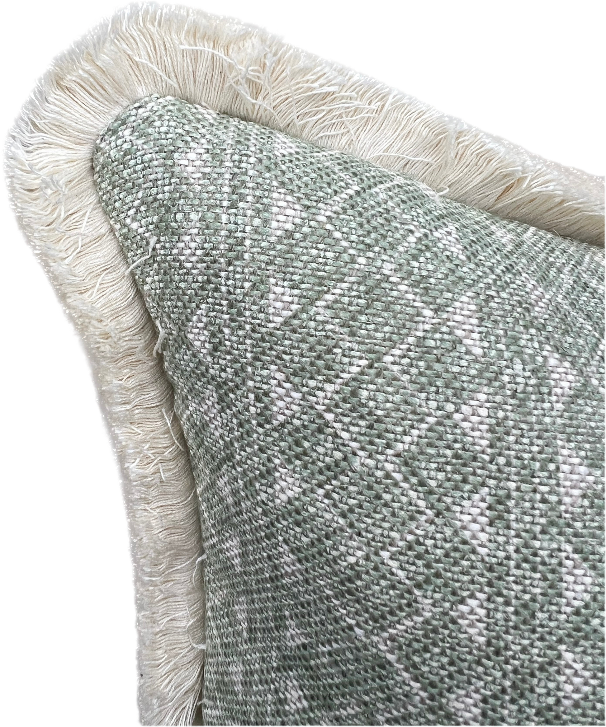 Cushions in green Fermoie Quantock 014 light green fabric with a thick, soft, cream fringe