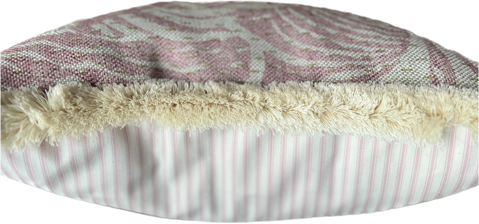 Fermoie Savernake fabric in pink 010 colourway with soft, thick cream fringe and pink ticking stripe back
