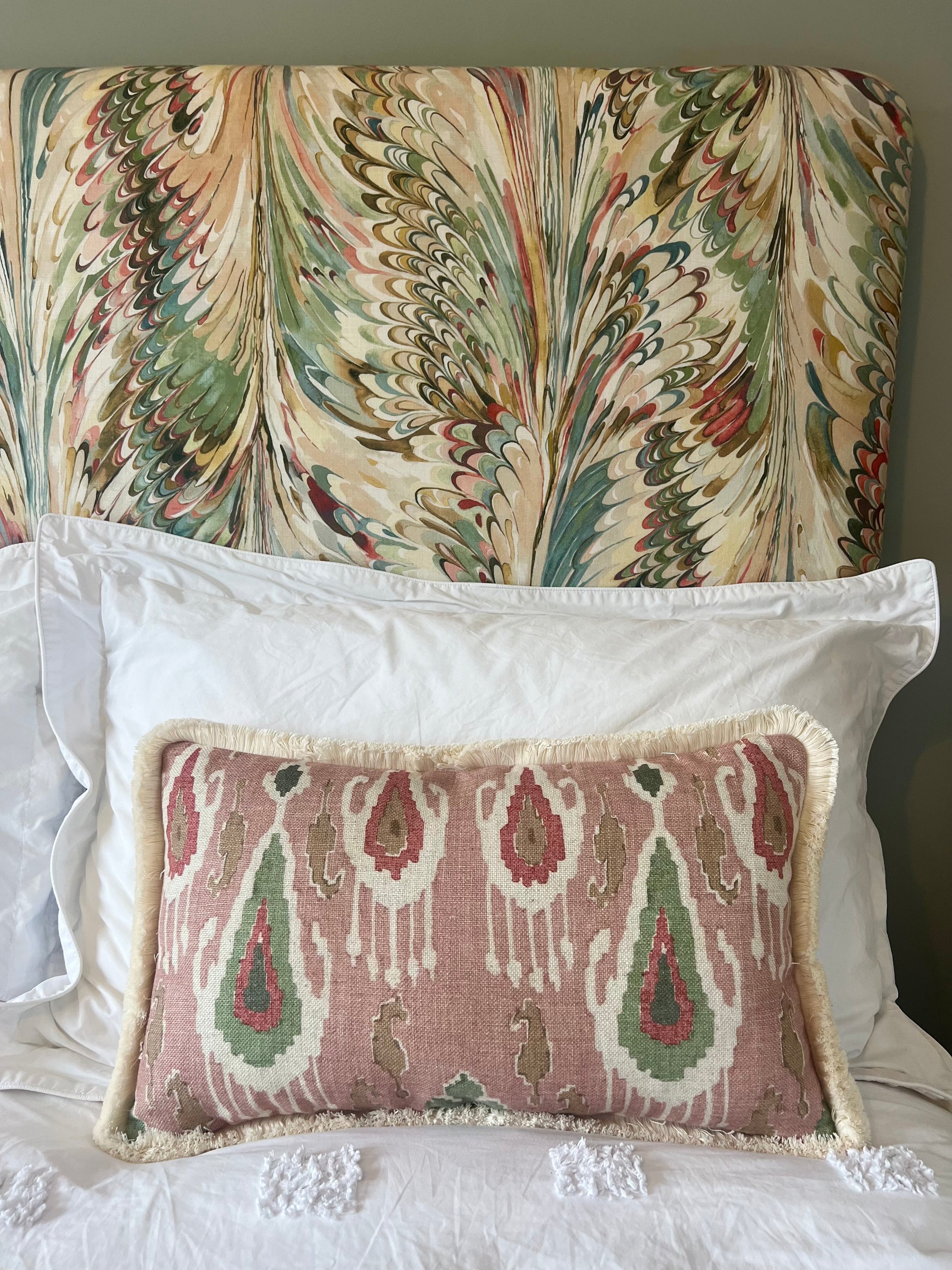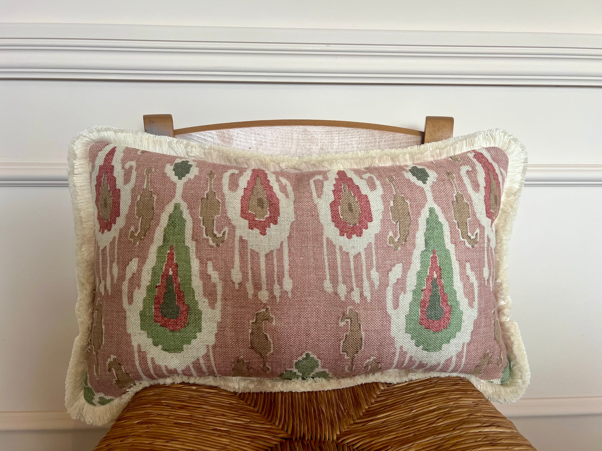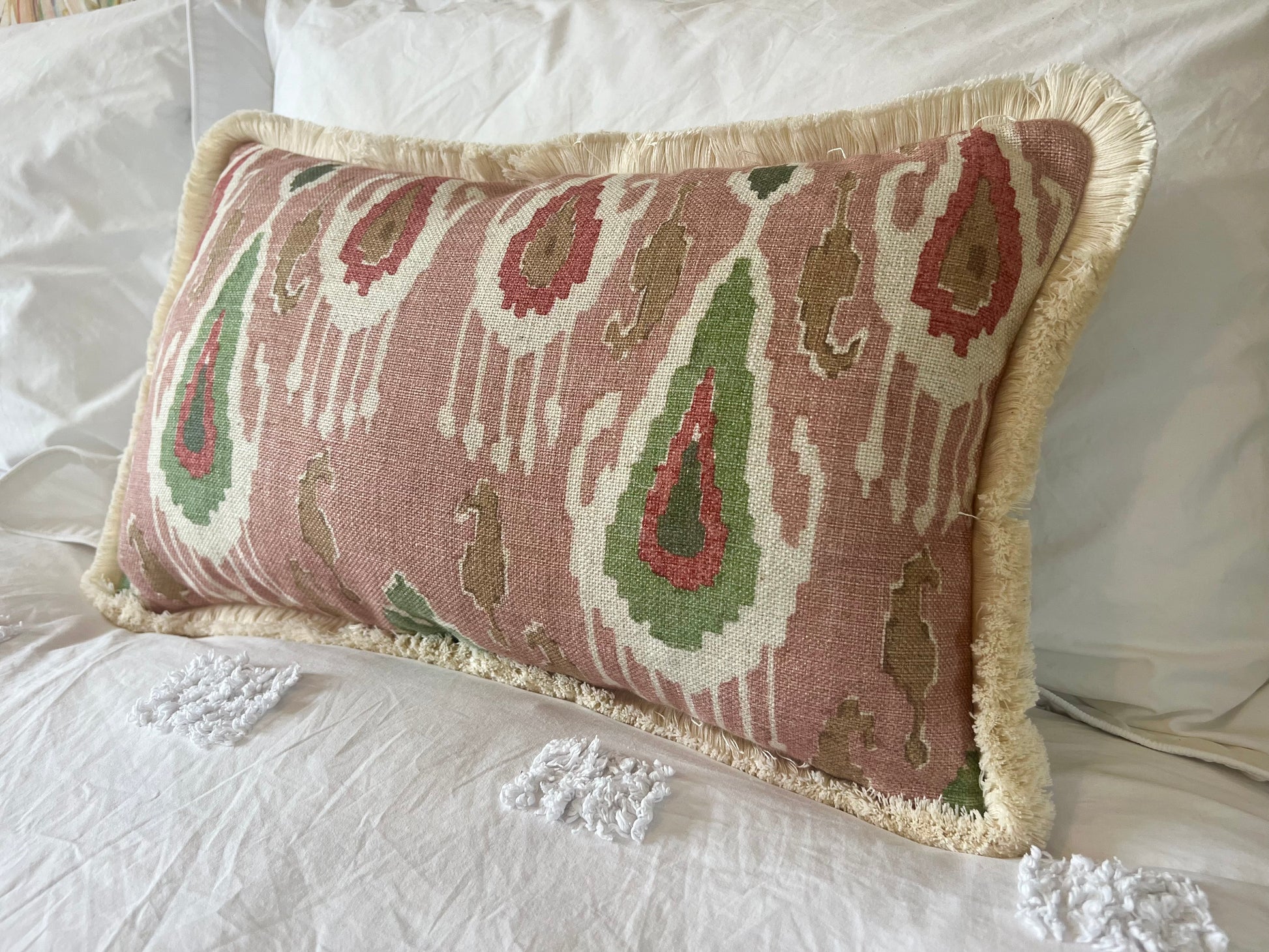 Cushions in GP & J Baker Ikat Bokhara fabric. Rose Green colourway with a soft cream fringe
