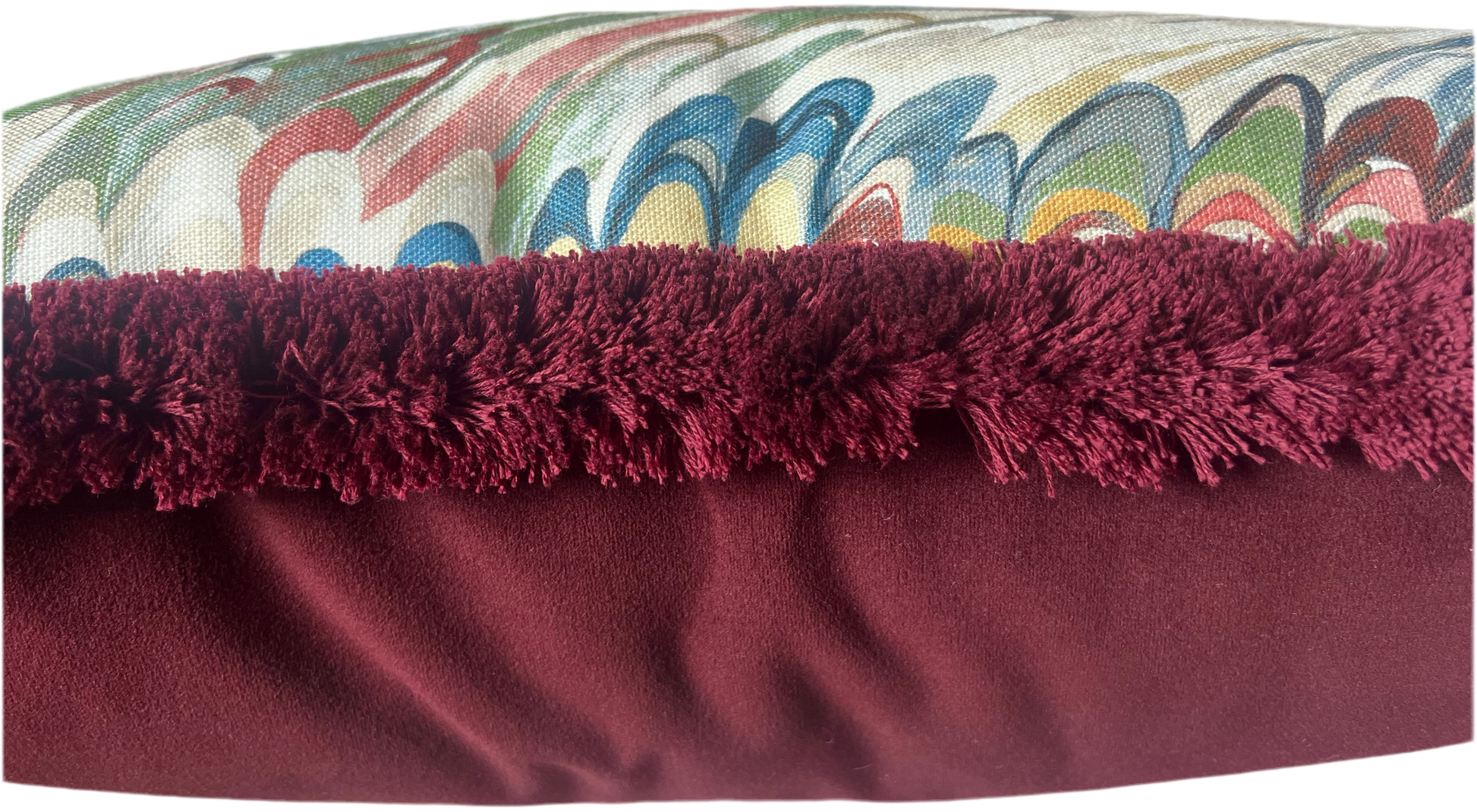 Cushions in Lee Jofa Taplow fabric. Spice / Leaf colourway with burgundy fringe and burgundy velvet back. There is a colour matched zip concealed in the fringe
