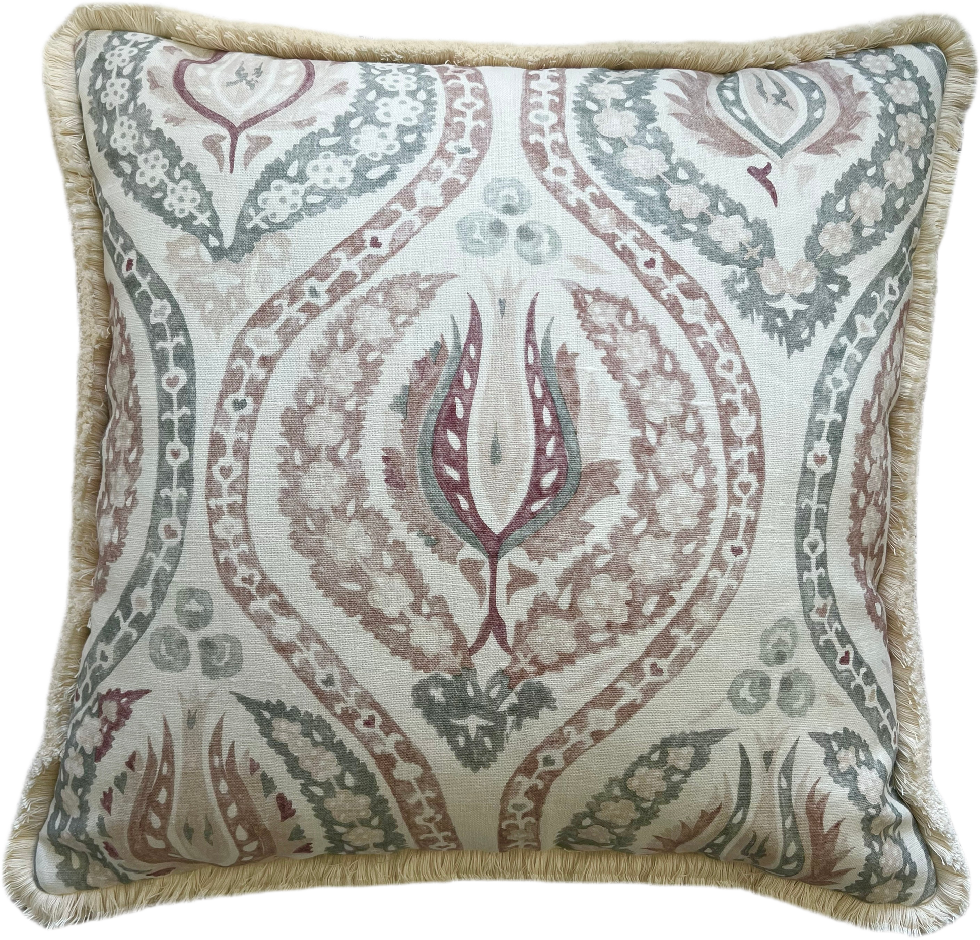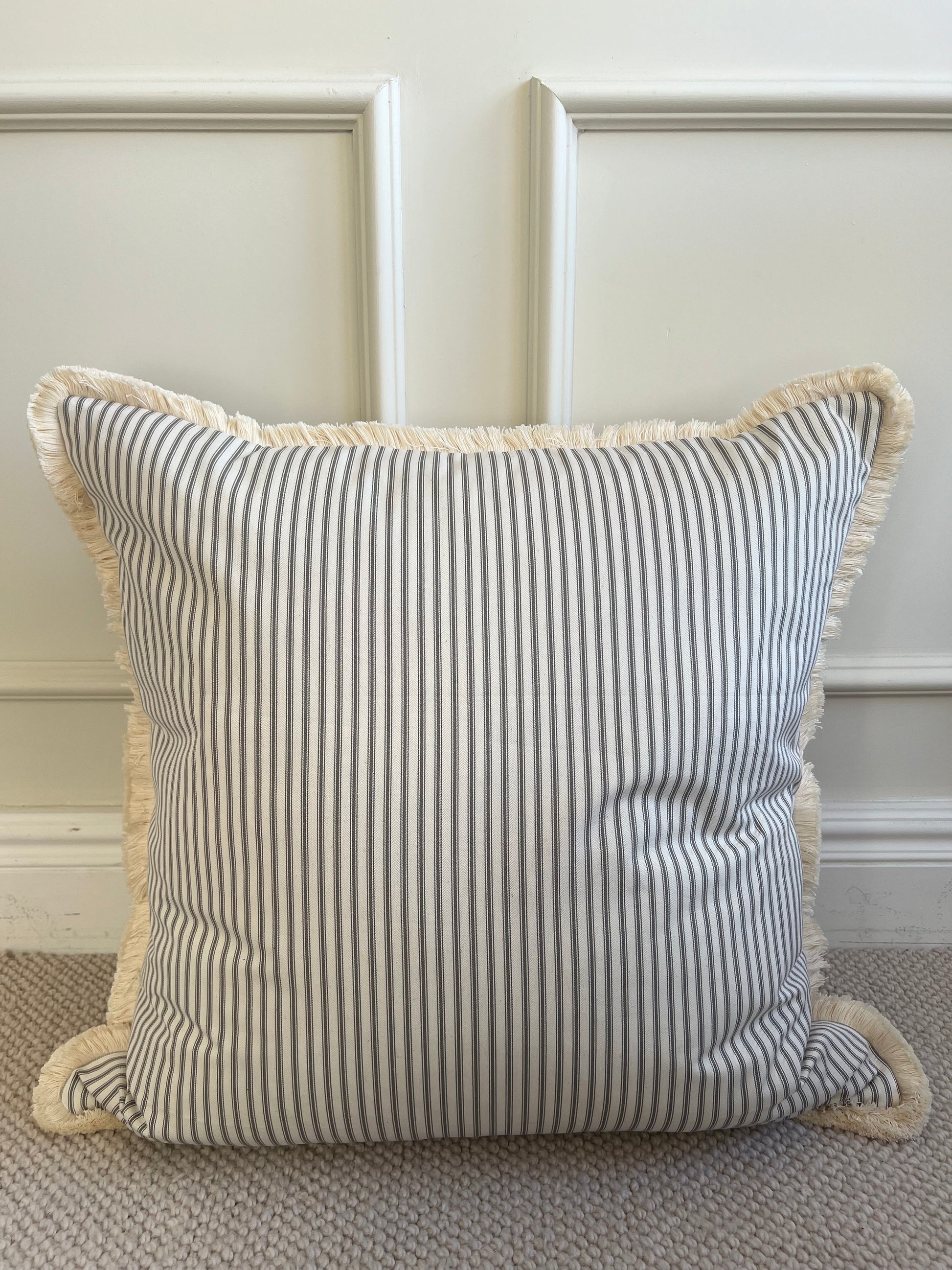 Cushions in Lewis & Wood Benaki Fabric. Rock Rose colourway with a soft, thick, cream fringe and grey ticking striped back