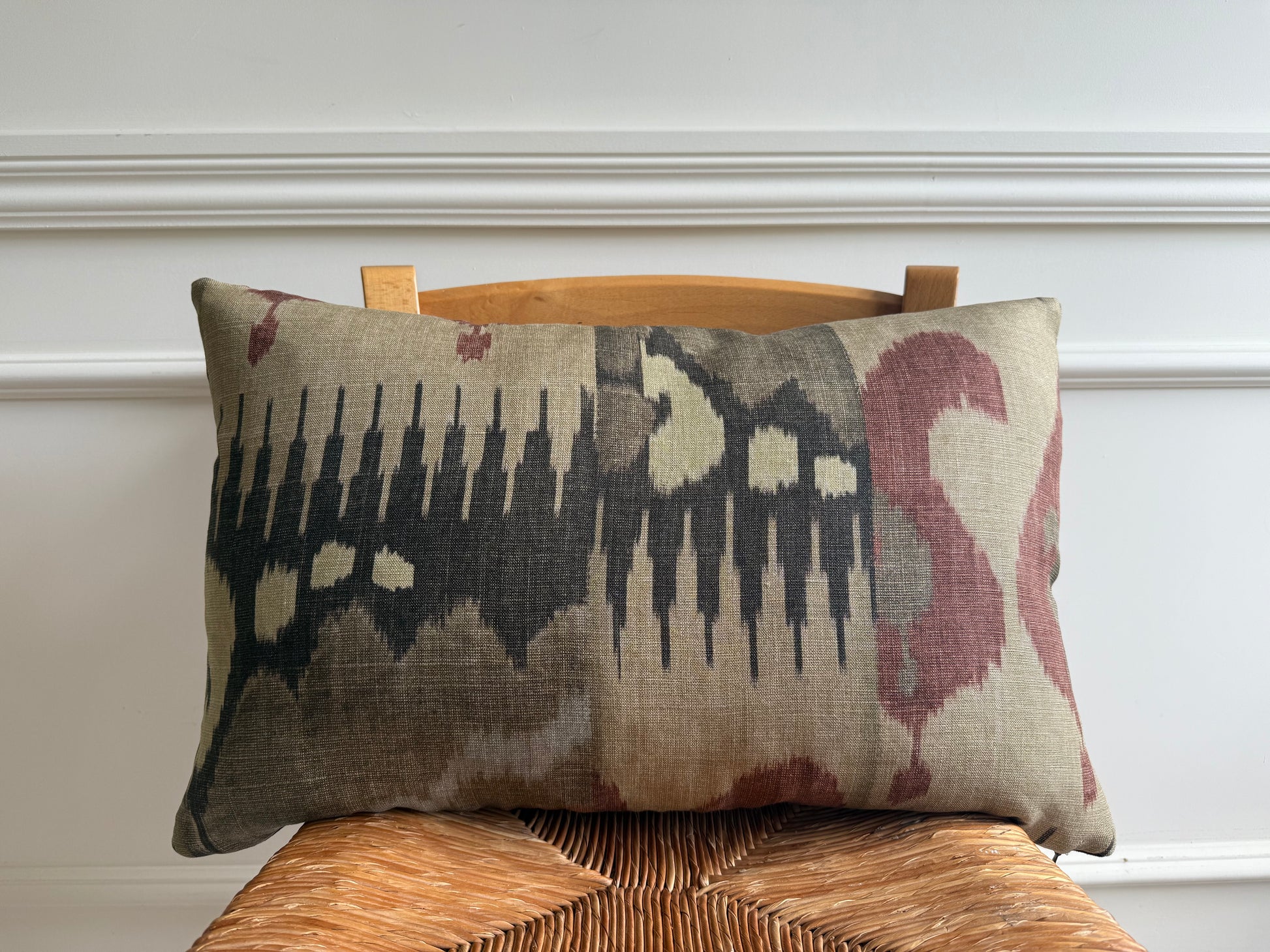 Cushions in Lewis & Wood Kimono fabric. Chilli Mocha colourway with a chocolate velvet back. The zip is concealed in the seam