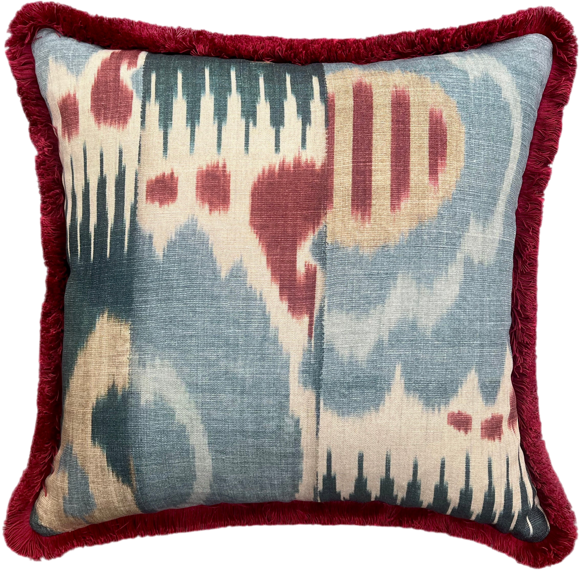 Cushions in Lewis & Wood Kimono fabric. Cayenne Blue colourway with a soft, thick red fringe and rouge velvet back. The zip is concealed in the seam