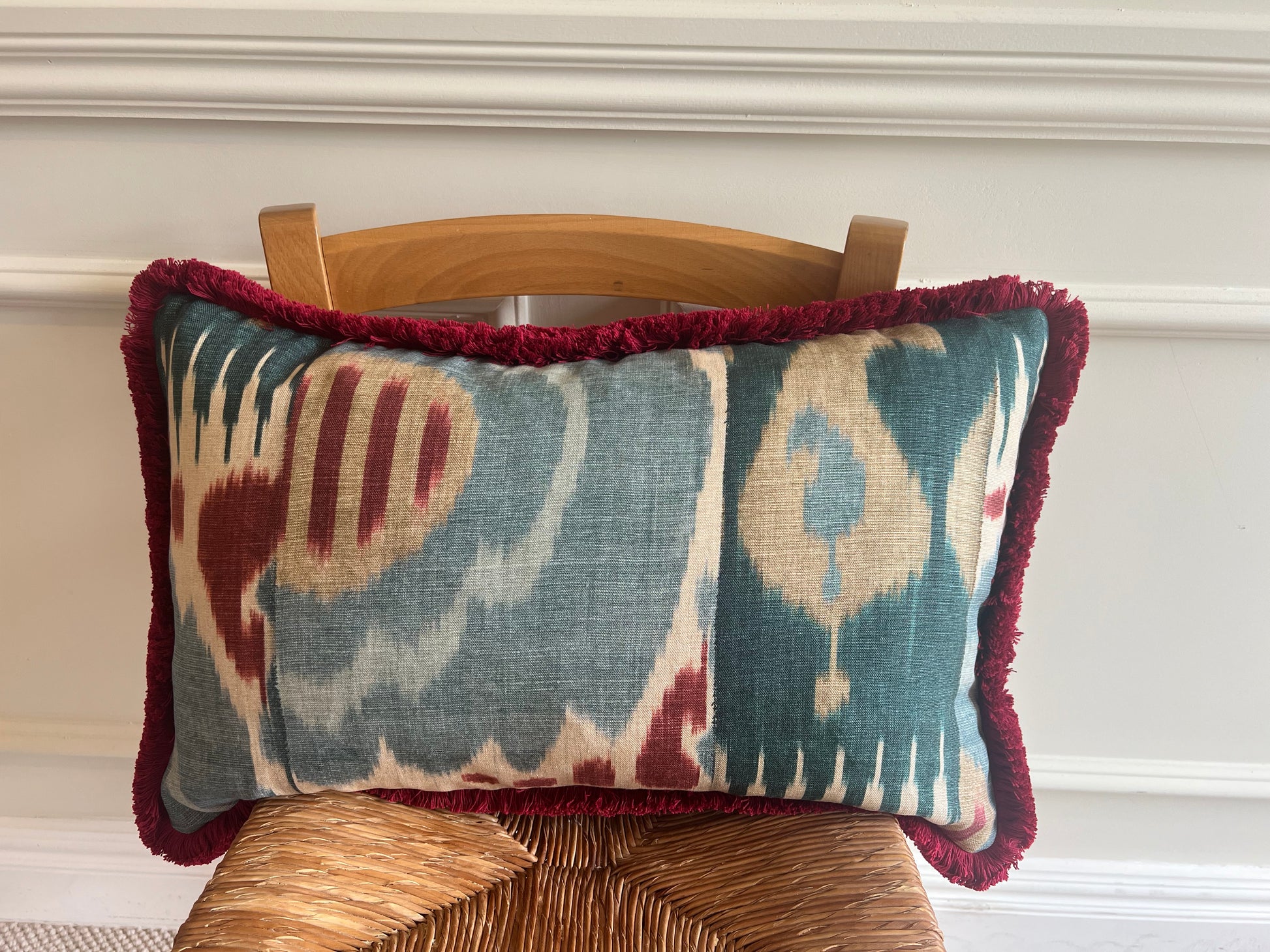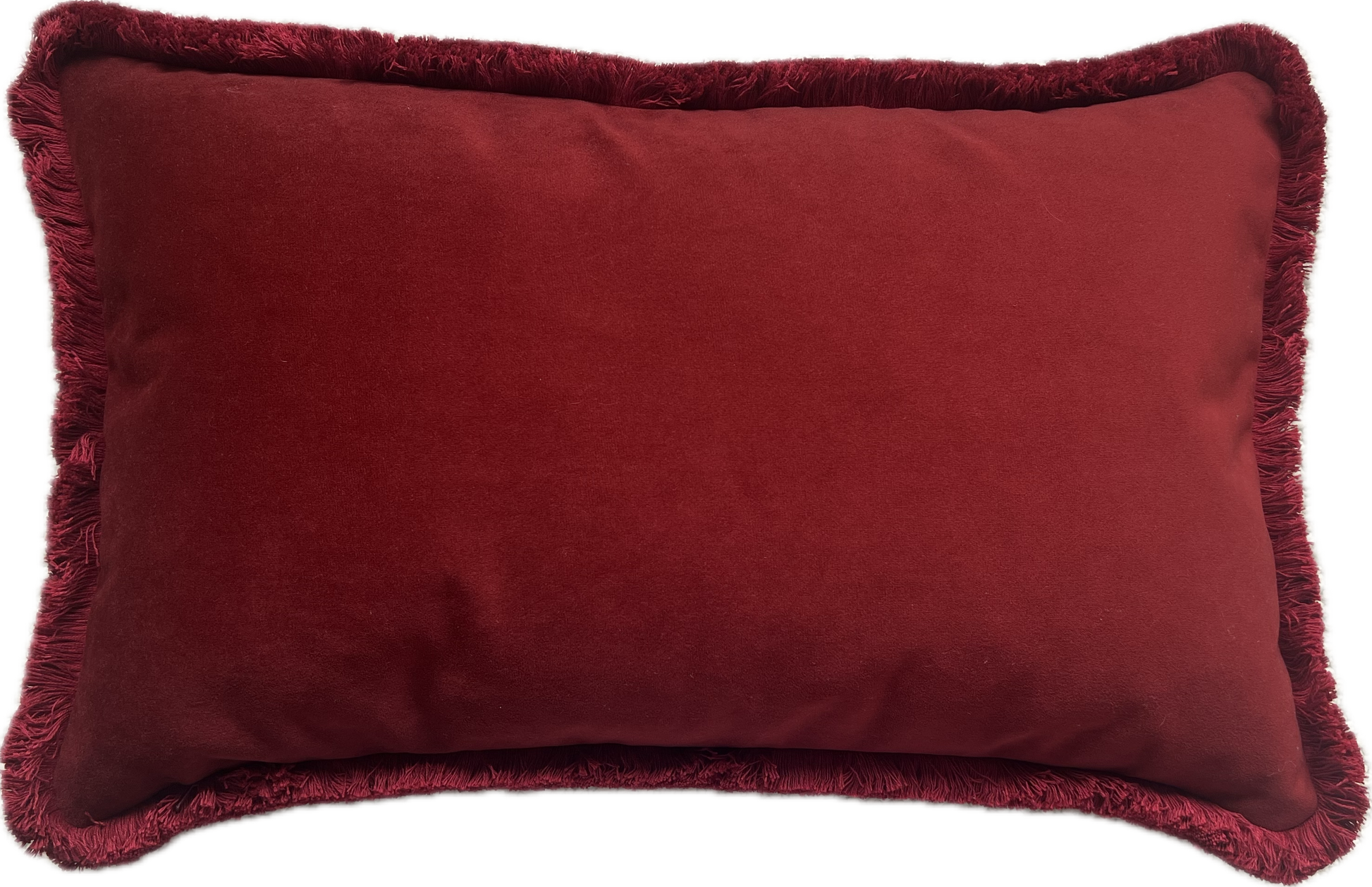 Cushions in Lewis & Wood Kimono fabric. Cayenne Blue colourway with a soft, thick red fringe and rouge velvet back. The zip is concealed in the seam