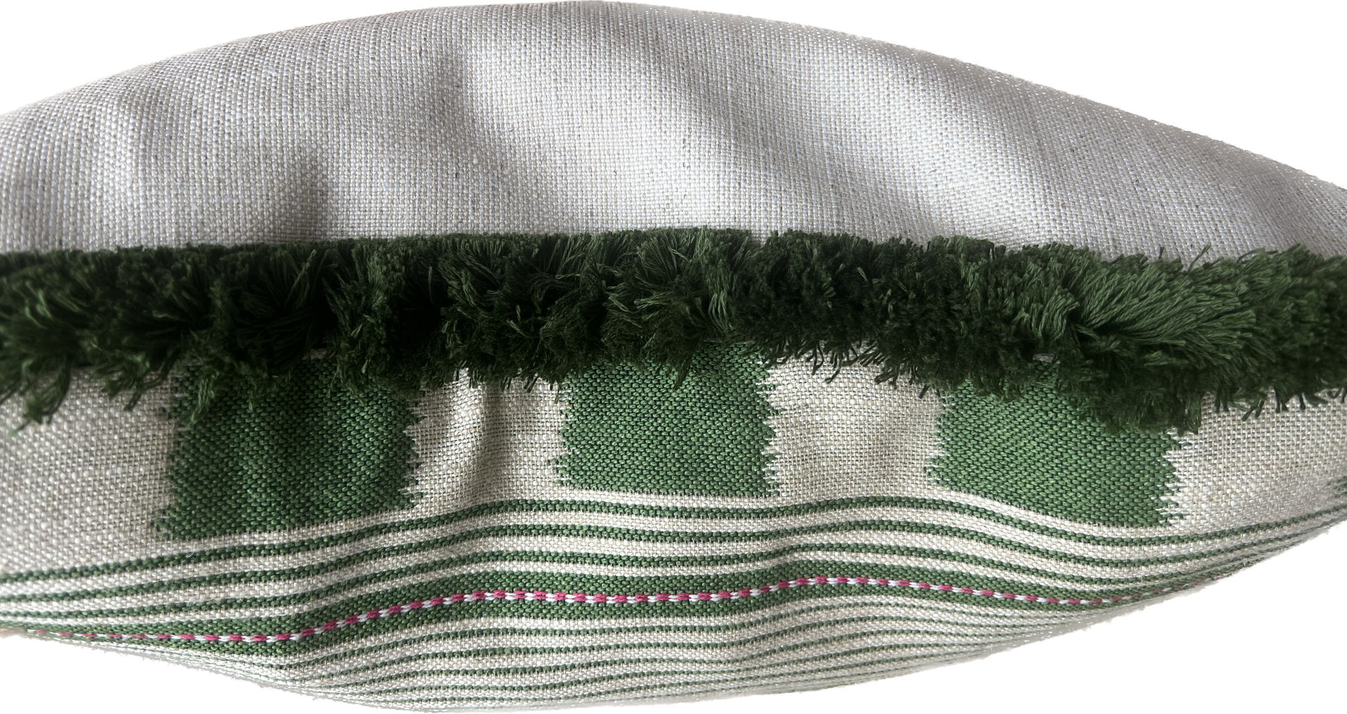 Cushions in Christopher Farr Lost and Found Fabric. Green colourway with a soft thick green fringe, neutral linen back and lapped zip