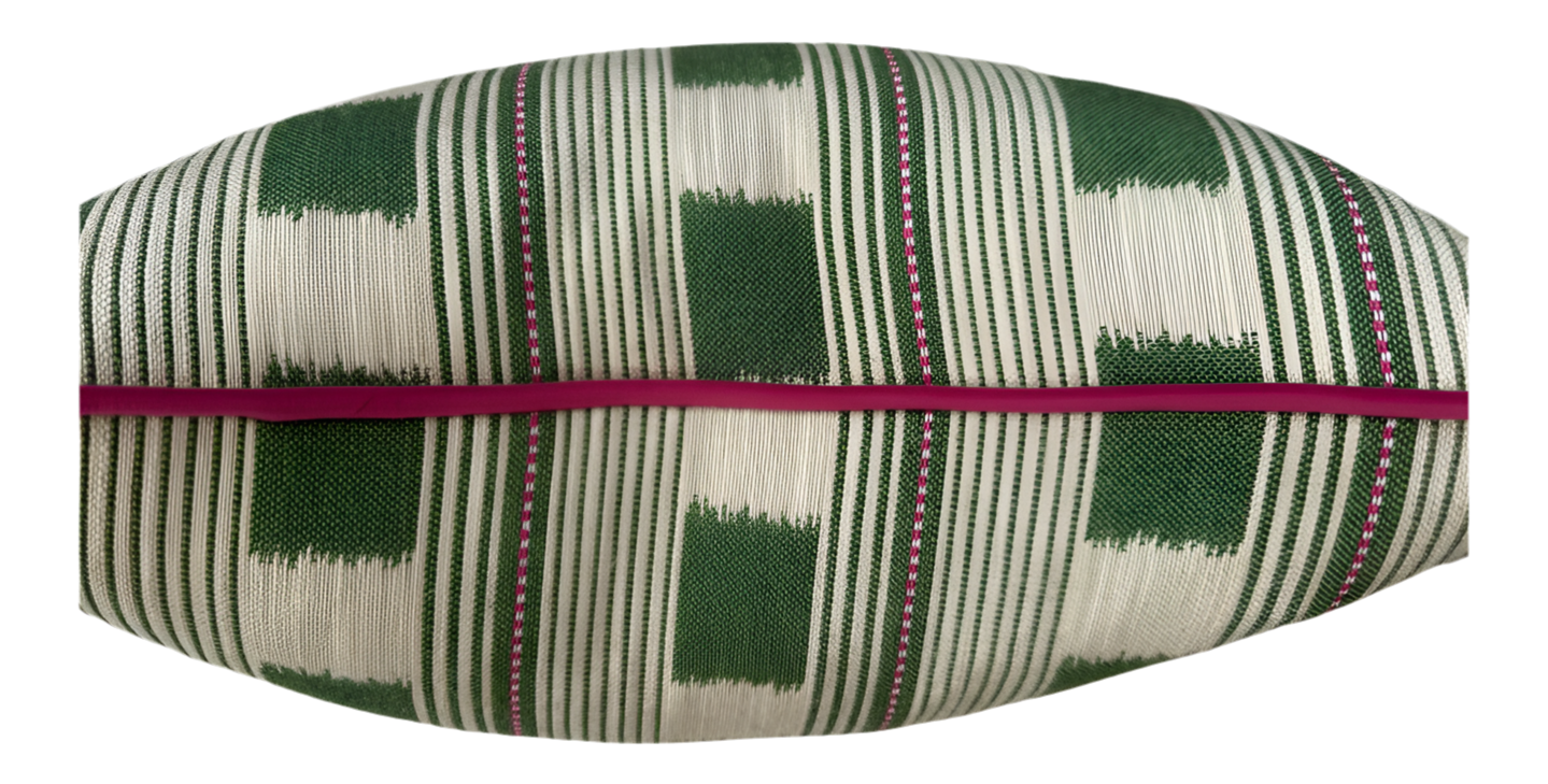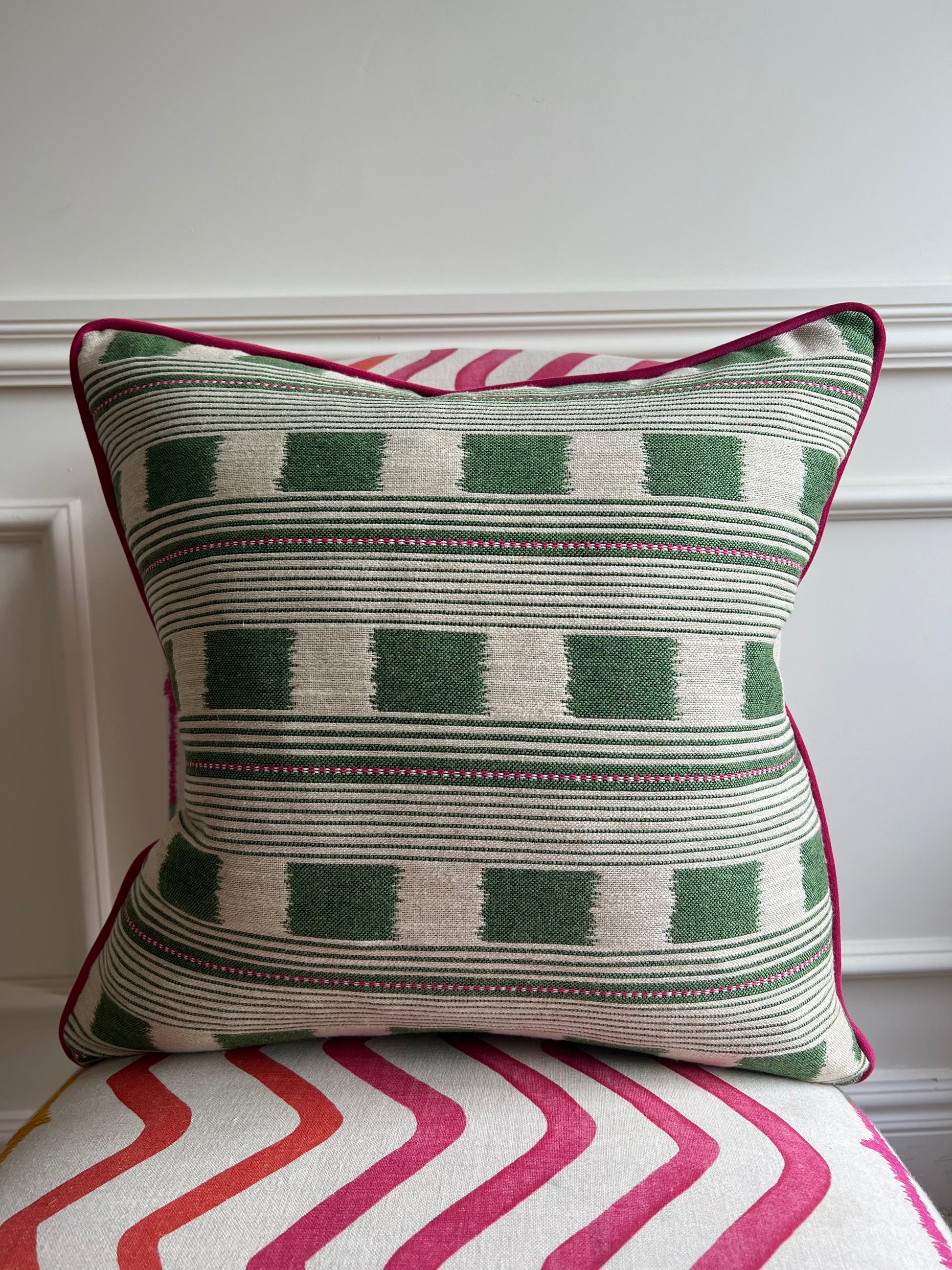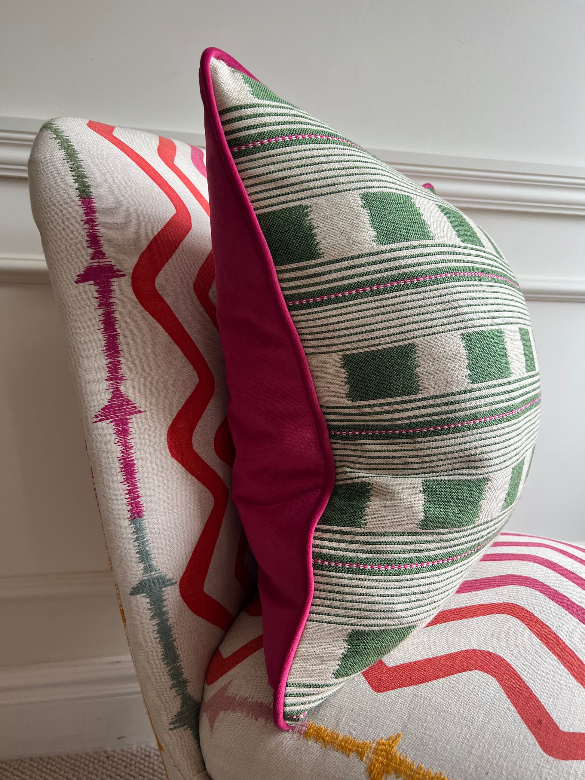 Cushions in Kit Kemp for Christopher Farr Lost and Found Fabric. Green colourway with contrast soft fuchsia velvet piping and hidden colour matched zip.