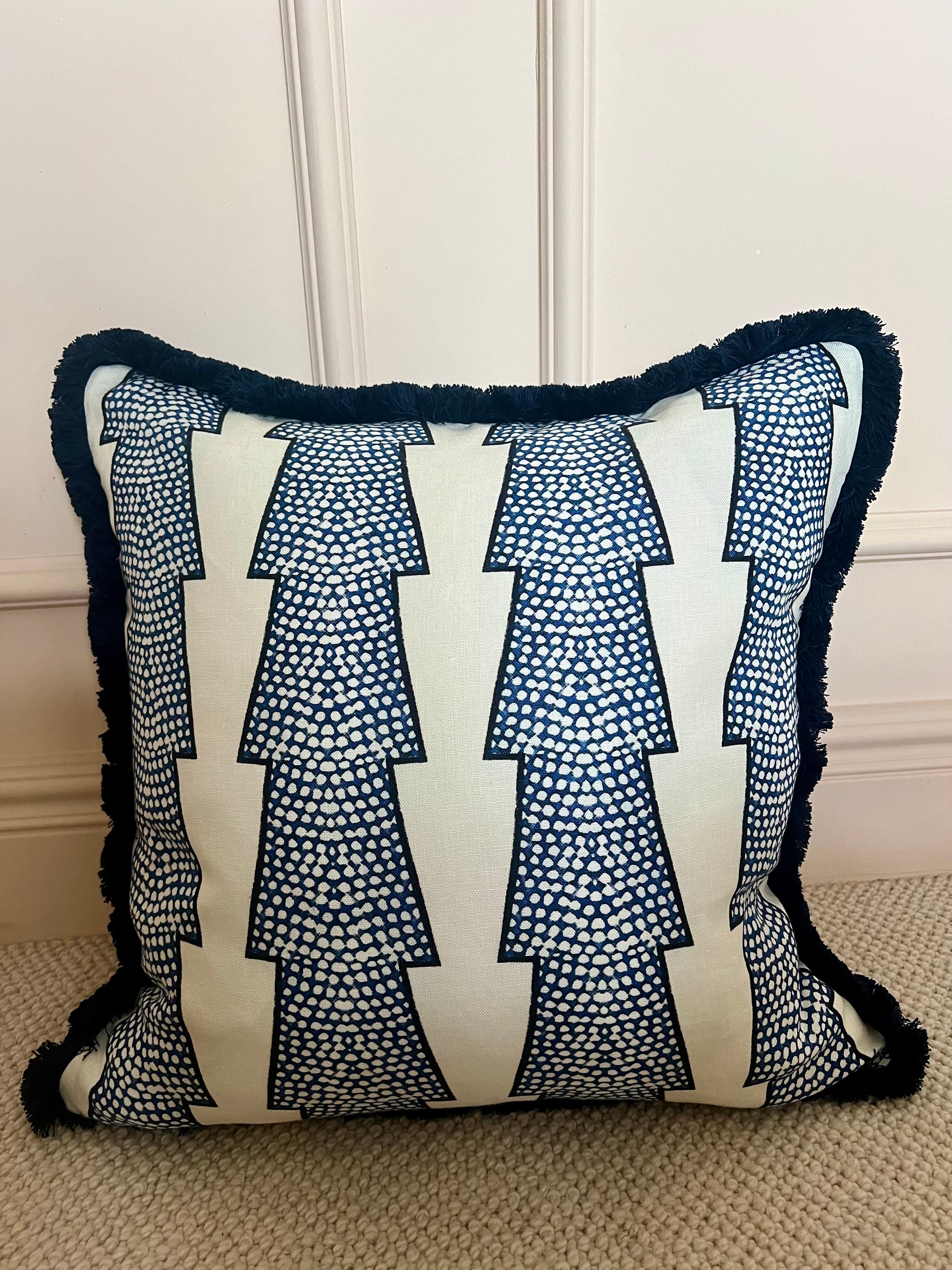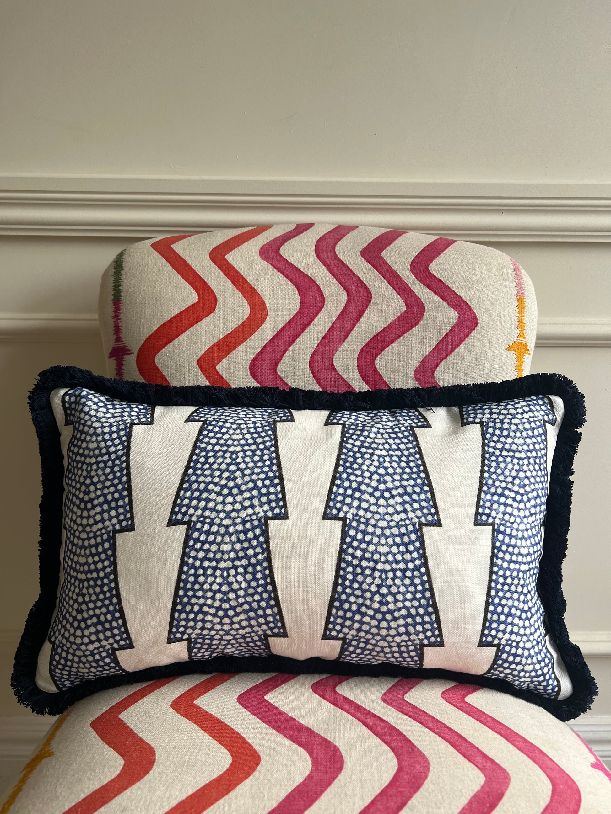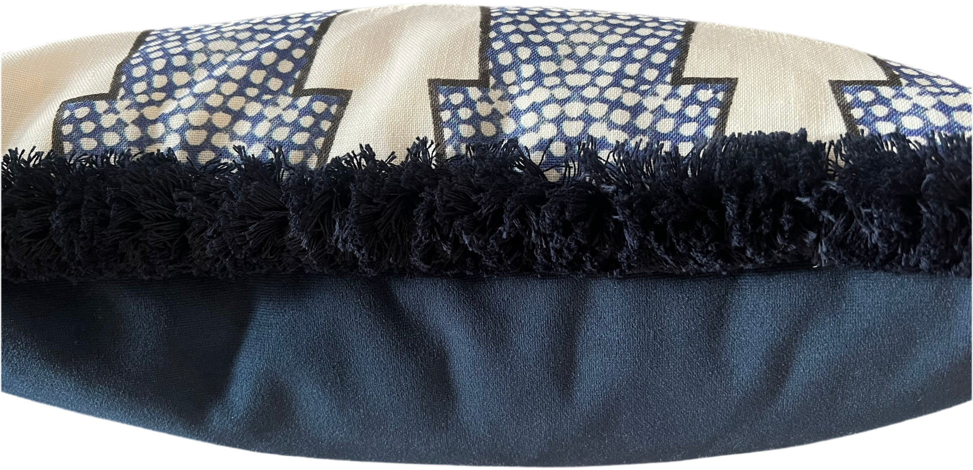 Cushions in Ottoline Spot & Arrow fabric with a thick navy fringe and luxuriously soft indigo velvet back