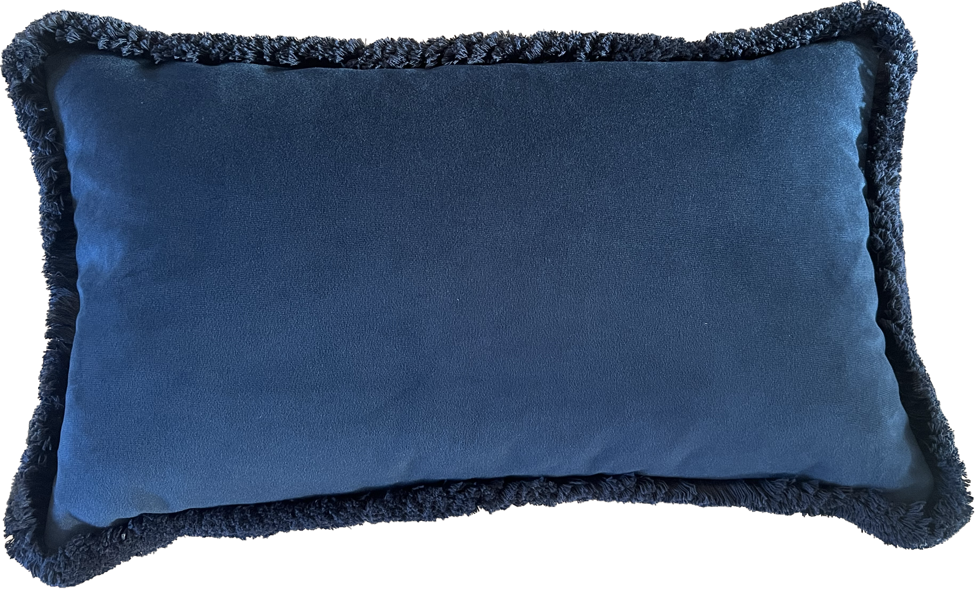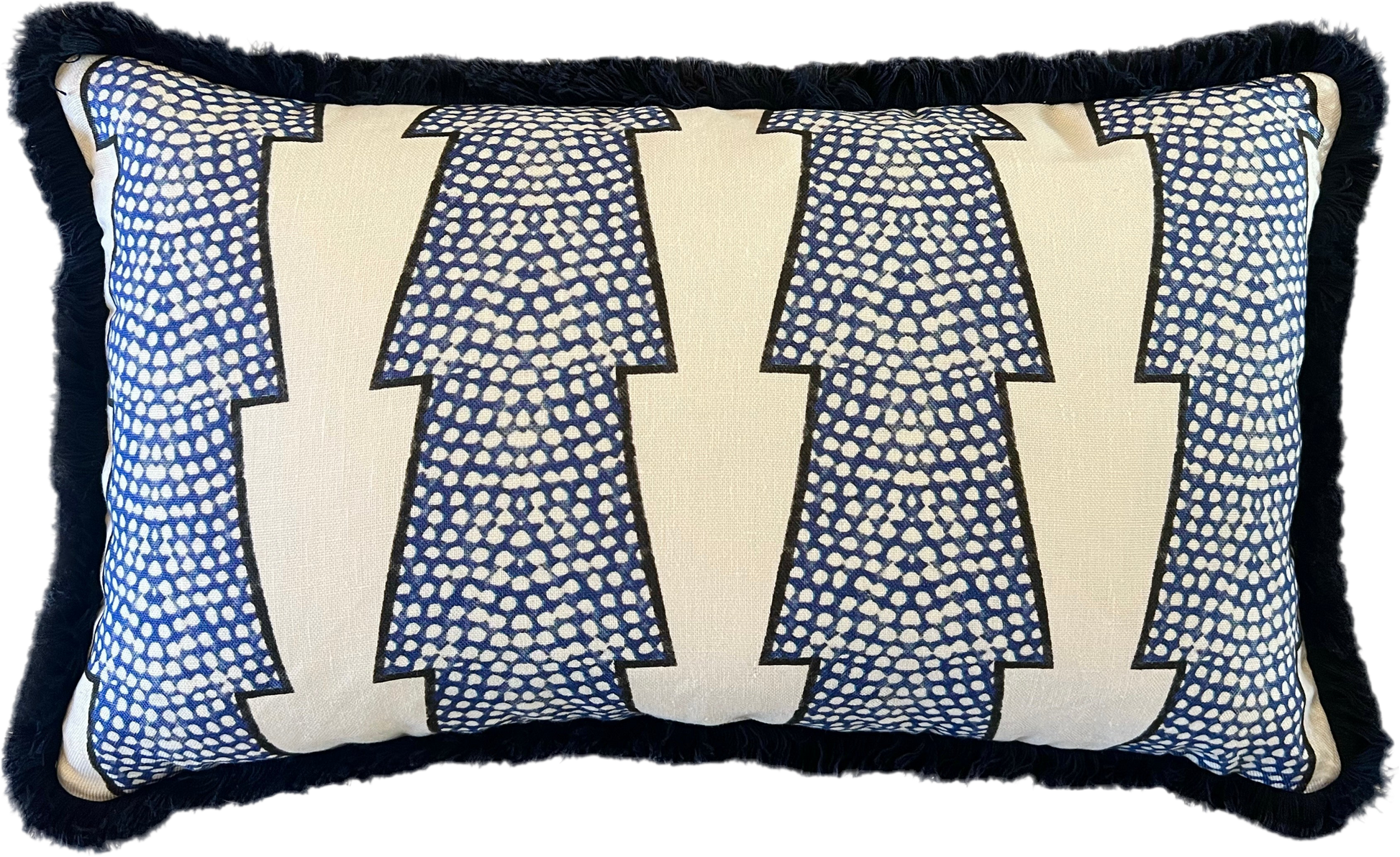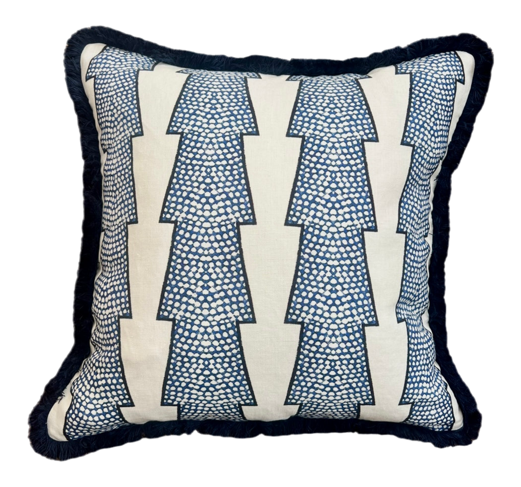 Cushions in Ottoline Spot & Arrow fabric with a thick navy fringe and luxuriously soft indigo velvet back