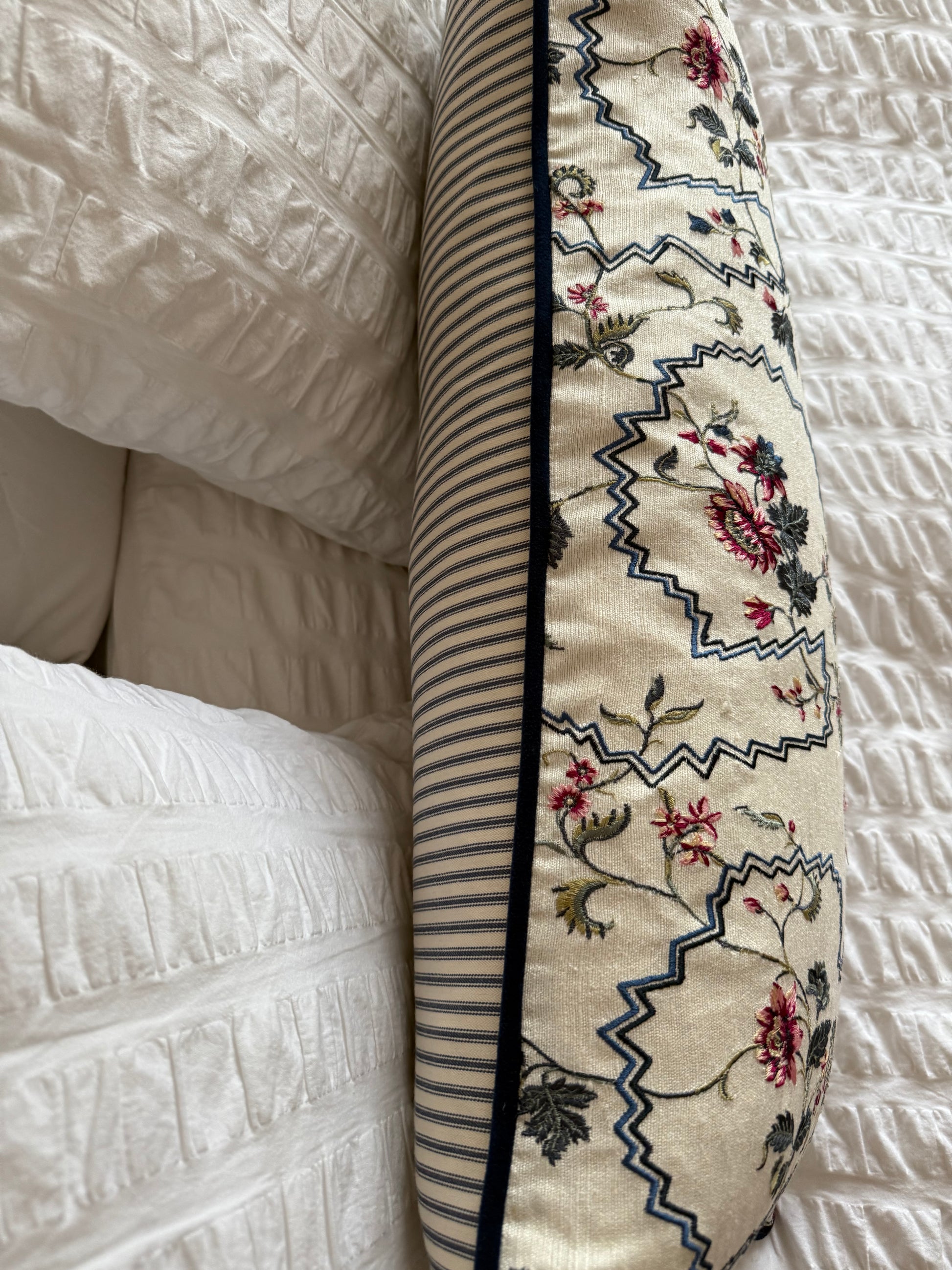 Cushions in La Pannonie Saphir handcrafted woven raw silk, with navy velvet piping and ticking striped backs. There will be made to order so the trim and fabric for the back can be changed if preferred