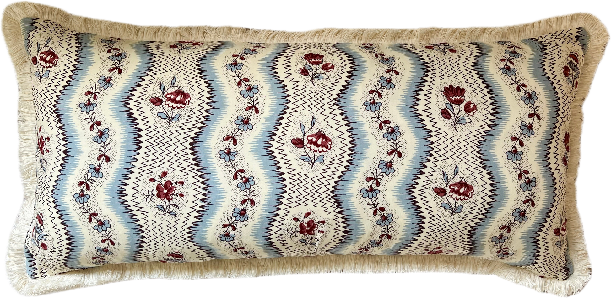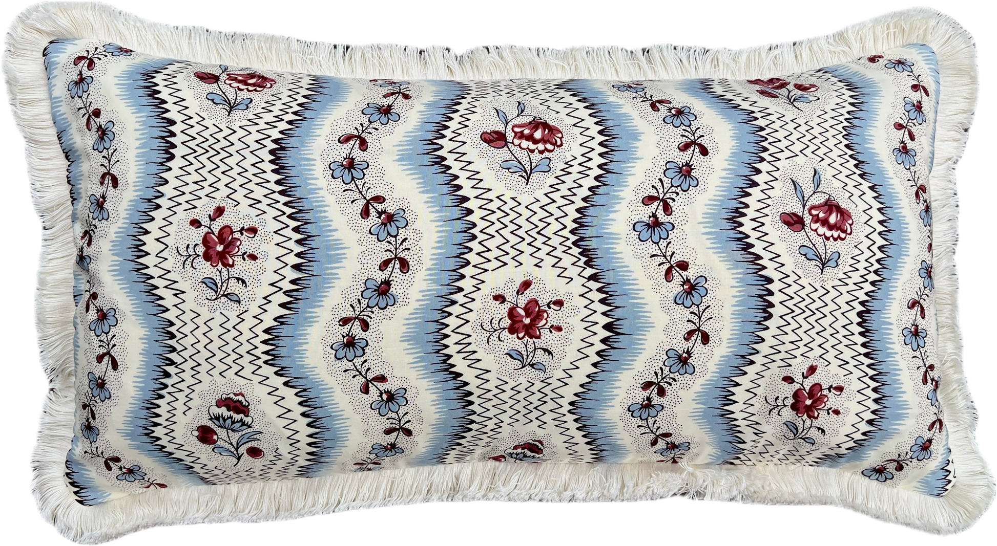 Cushions in Pierre Frey Le Manach fabric. Bleu Rouge colourway with a cream fringe and cream linen back. There is a zip concealed in the fringe