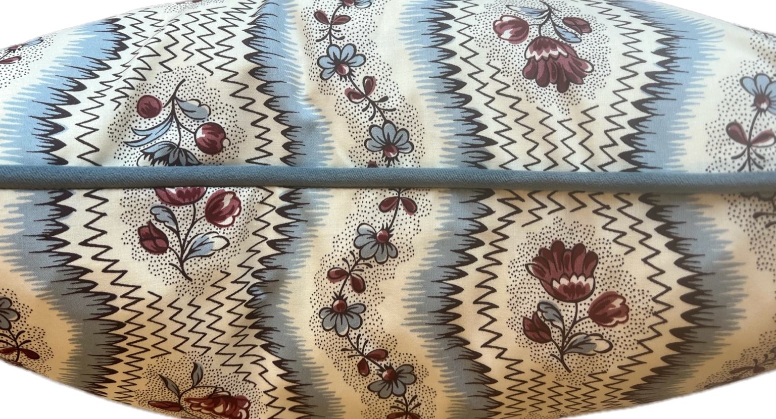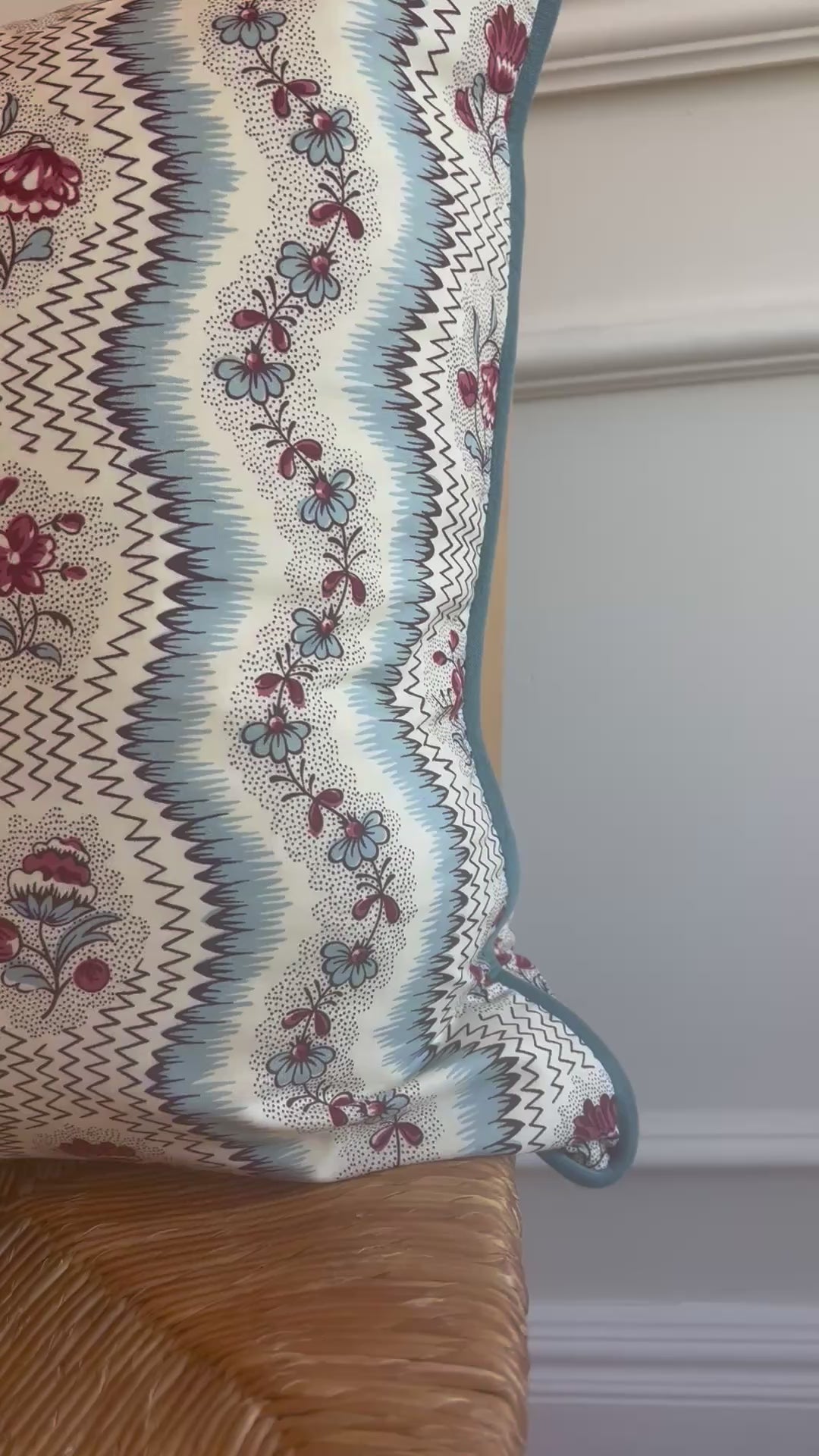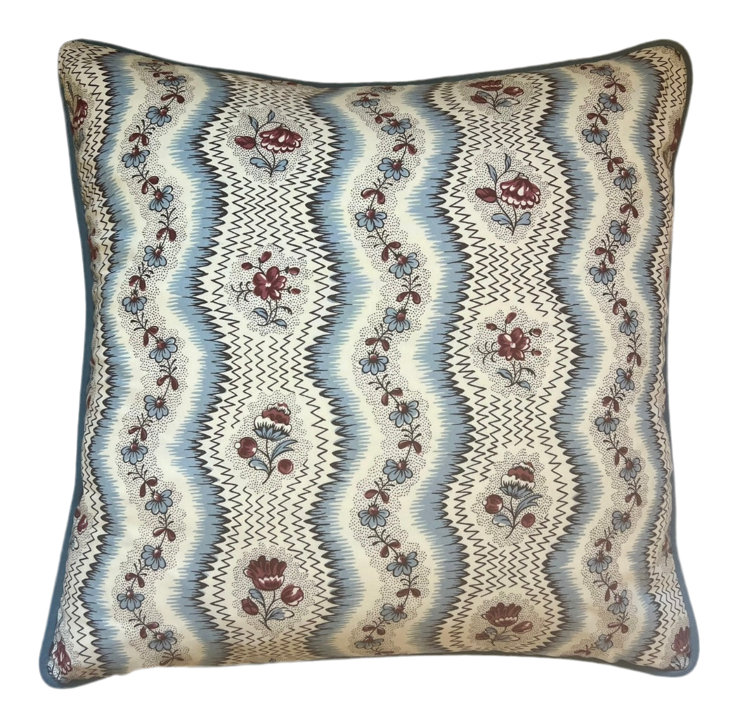 Cushions in Pierre Frey Le Manach fabric. Bleu Rouge colourway with a pale blue velvet piping. There is a zip concealed in the seam