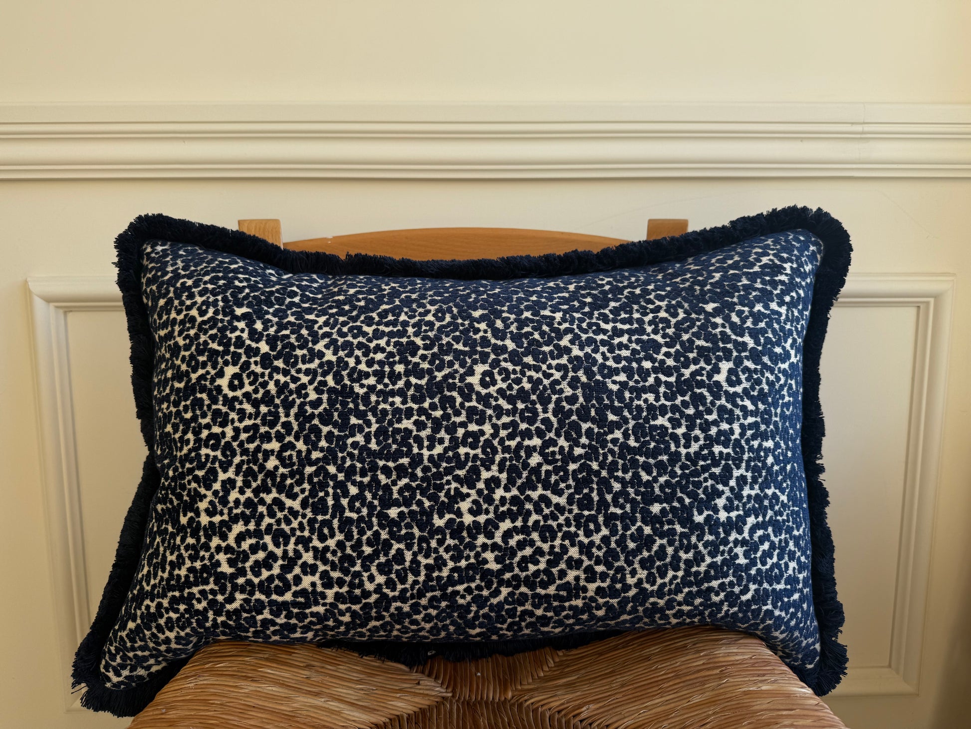 Lumber cushions in Pierre Frey Mini Leopard with navy brush fringe and Romo Miro Twilight linen back