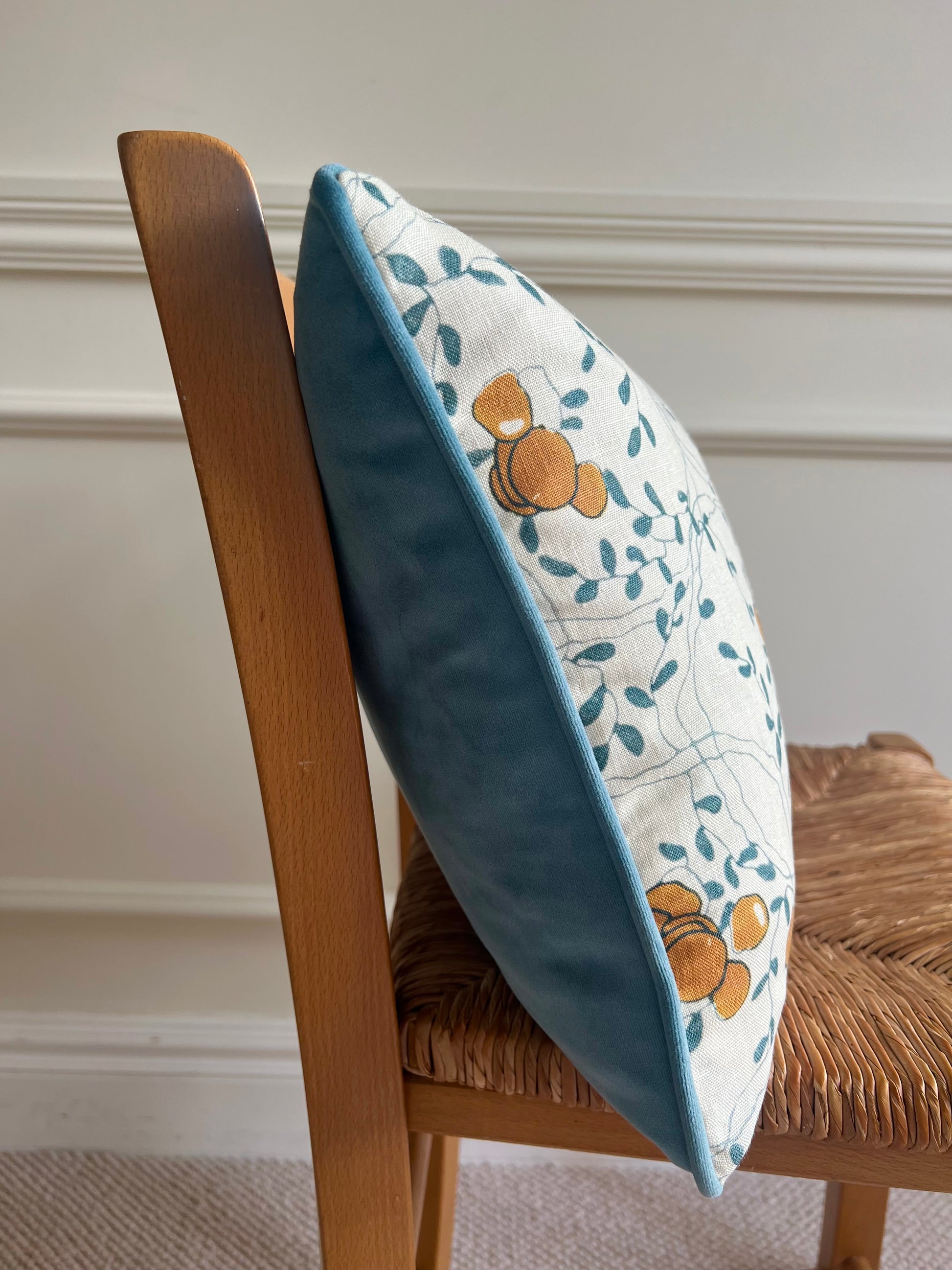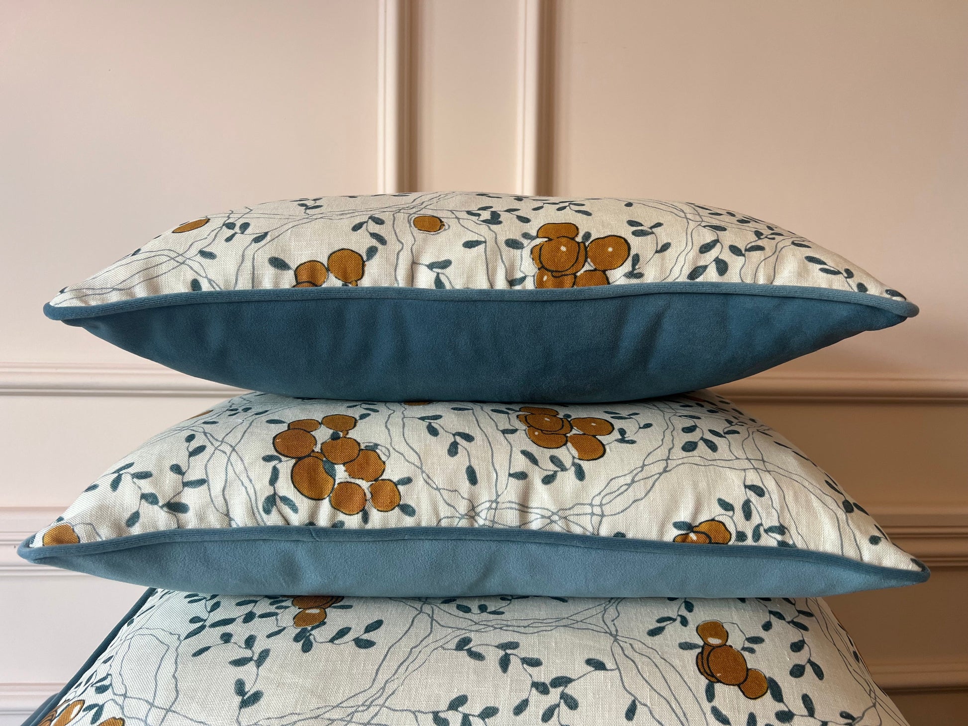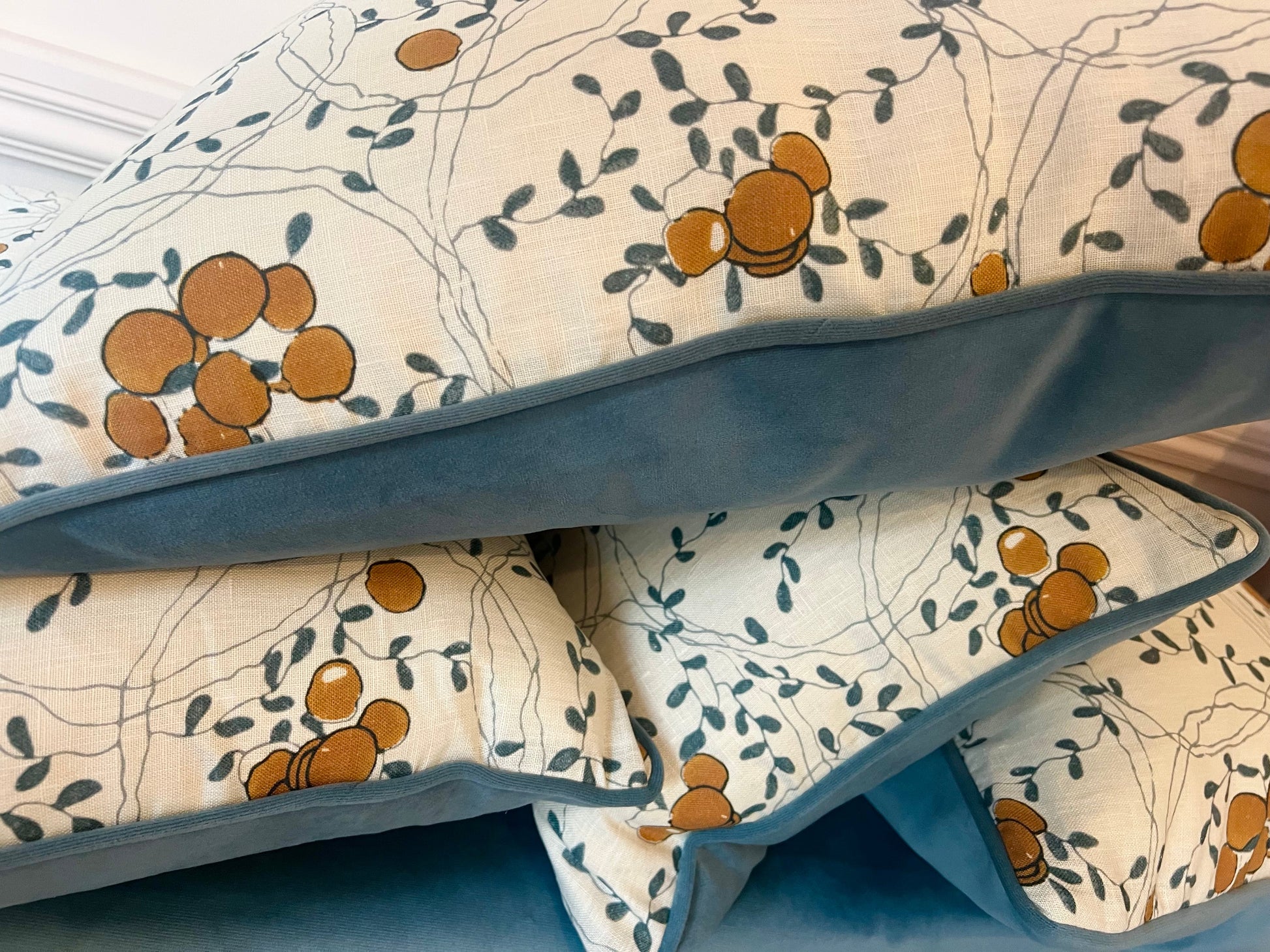 Cushions in Rosa Bernal Sevilla Fabric. Azul Ochre colourway with airforce blue piping and backs.