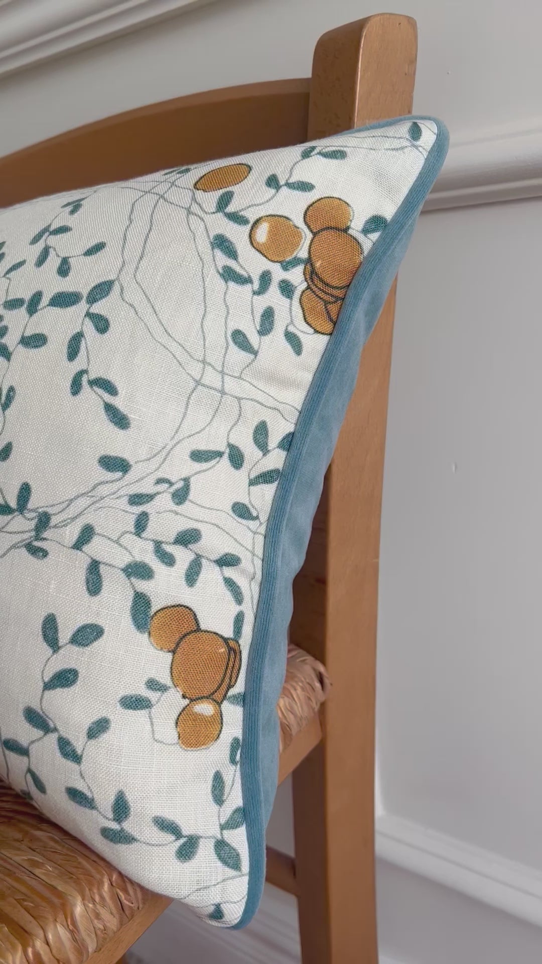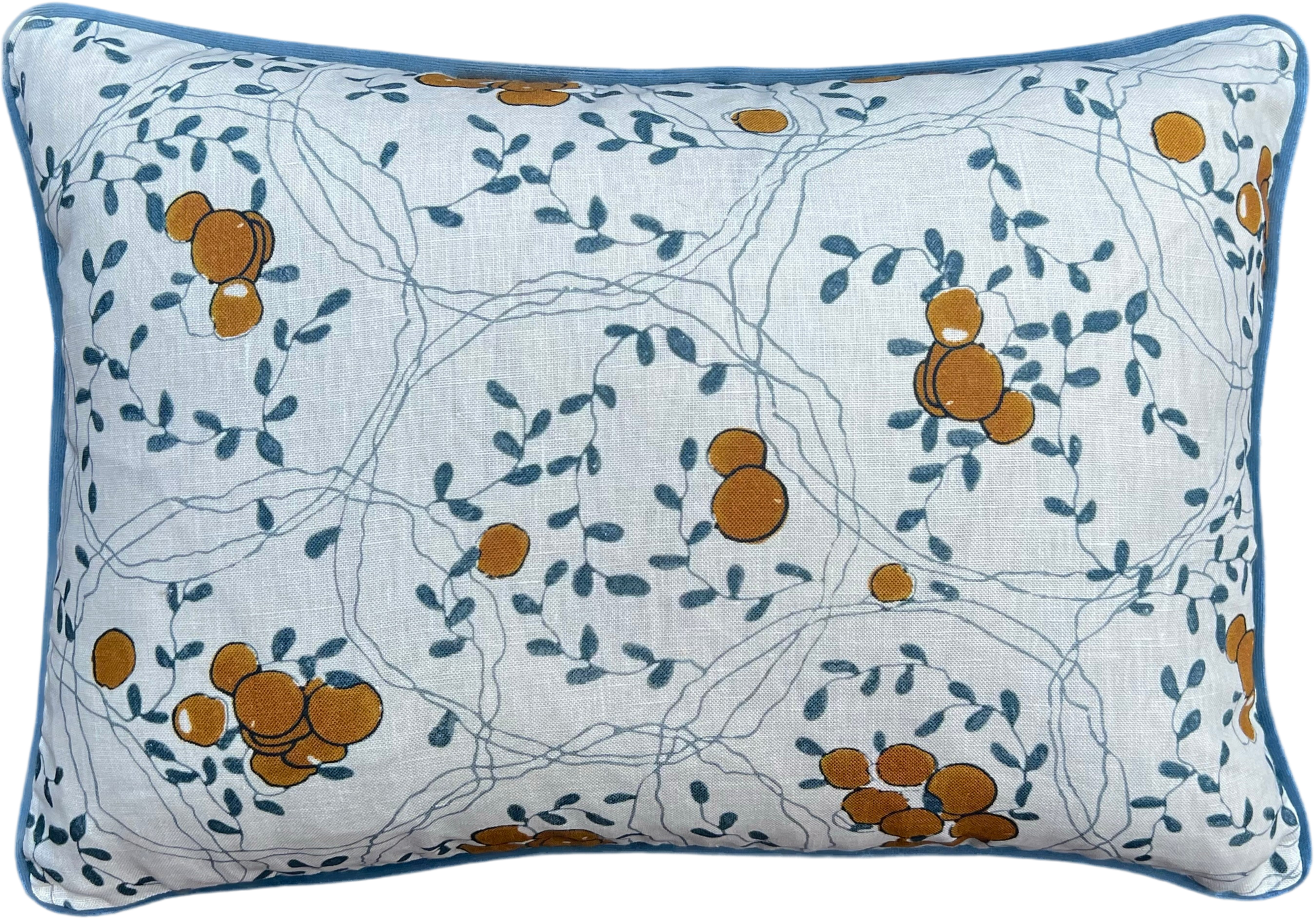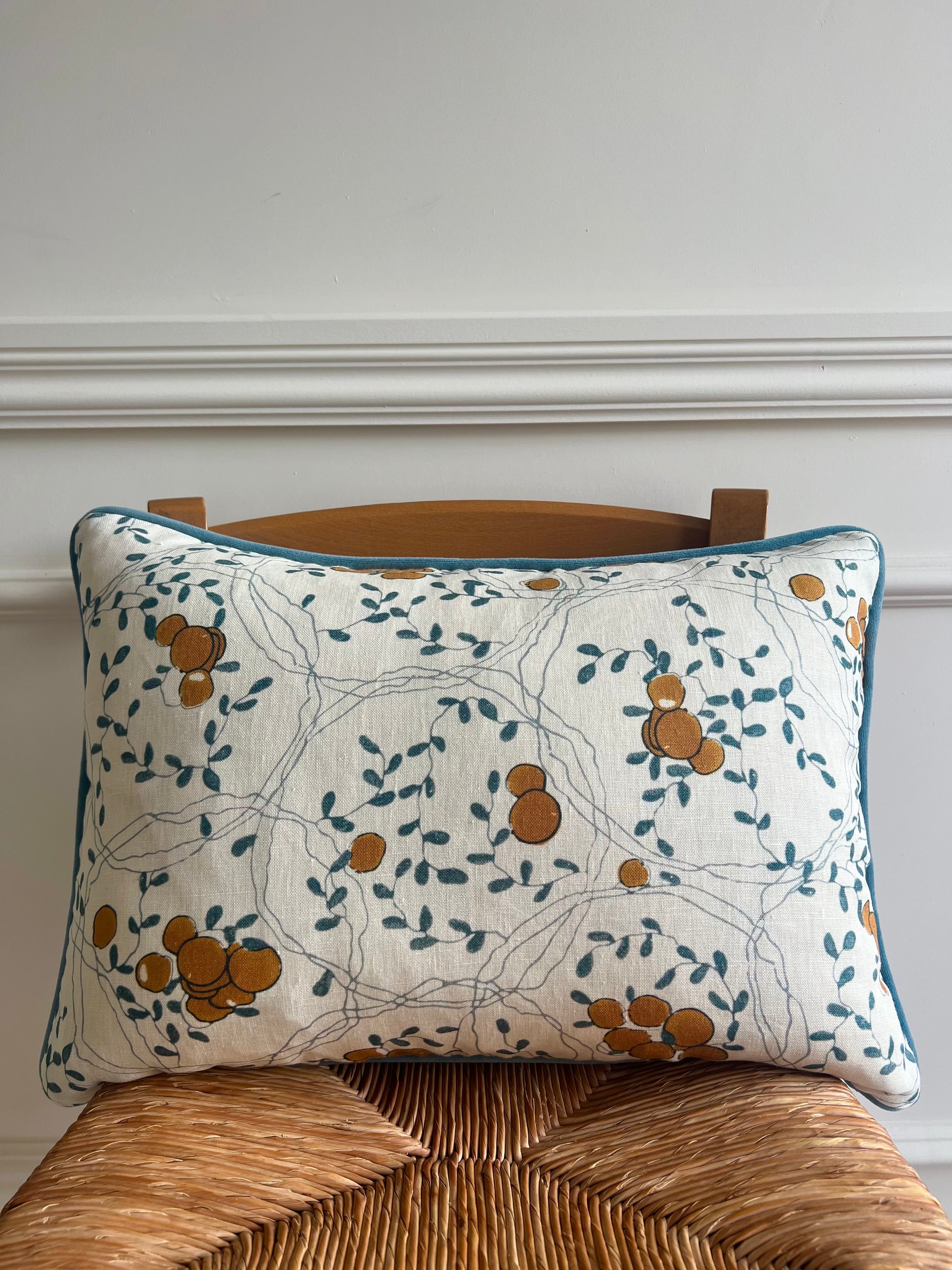 Cushions in Rosa Bernal Sevilla Fabric. Azul Ochre colourway with airforce blue piping and backs.