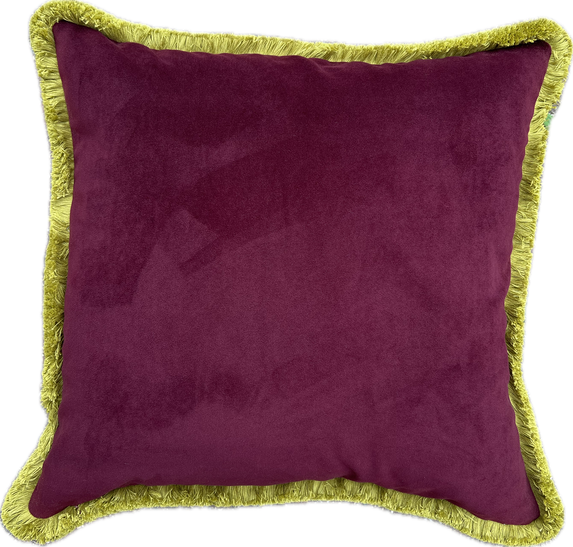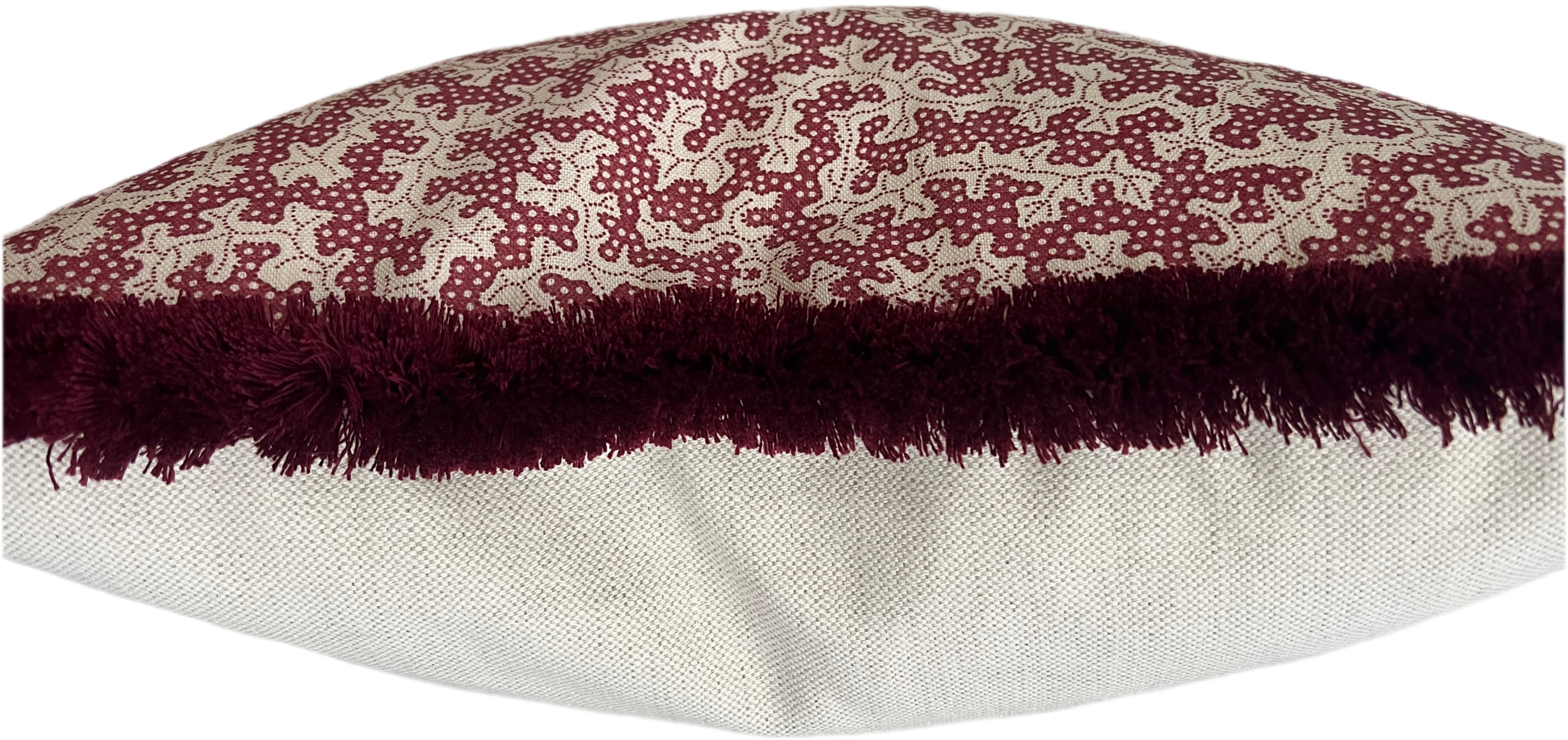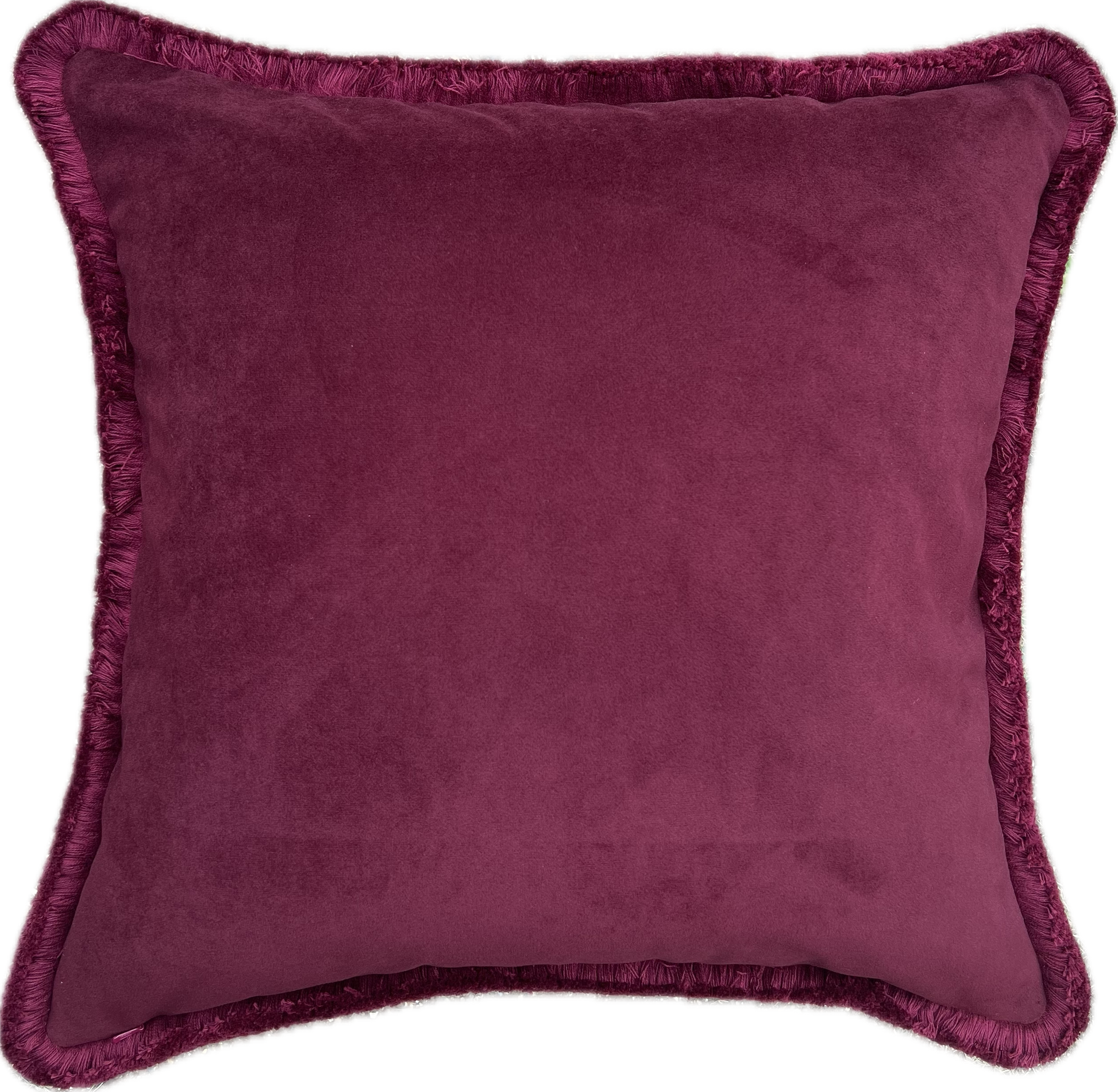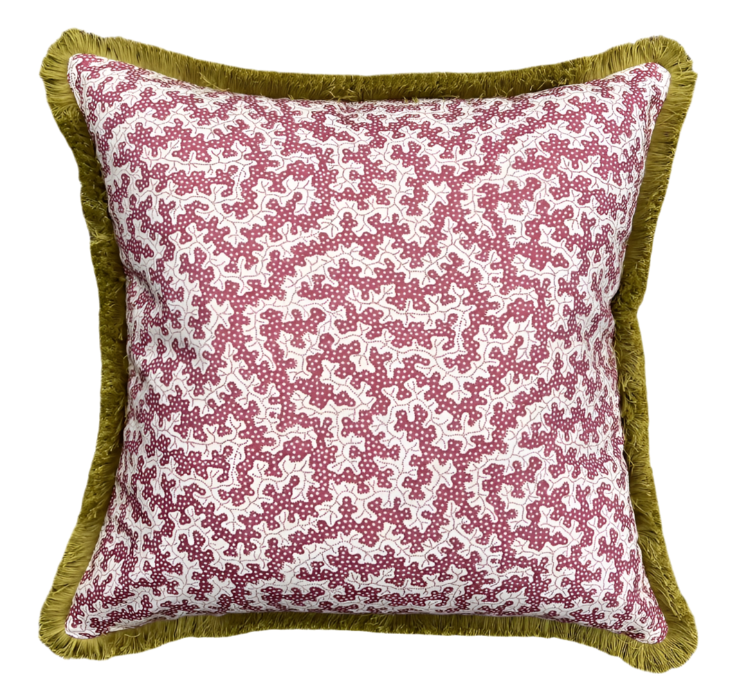 Cushions in Sanderson Truffle fabric. Damson colourway with a choice of trim and fabric for the back