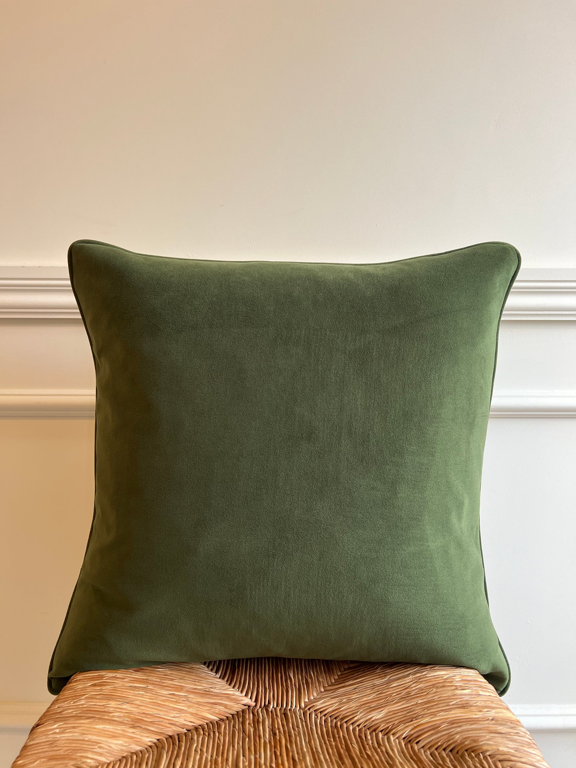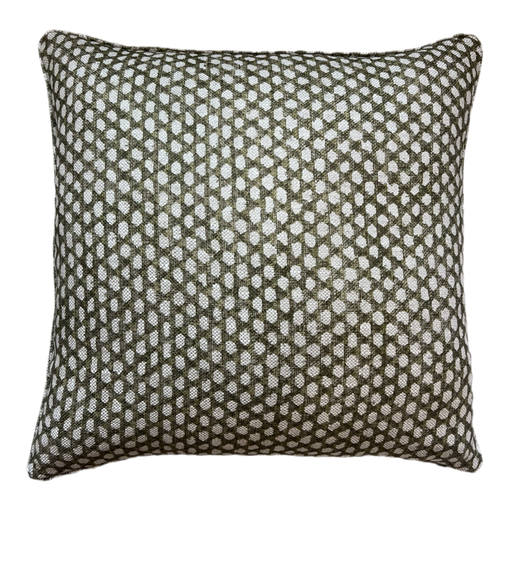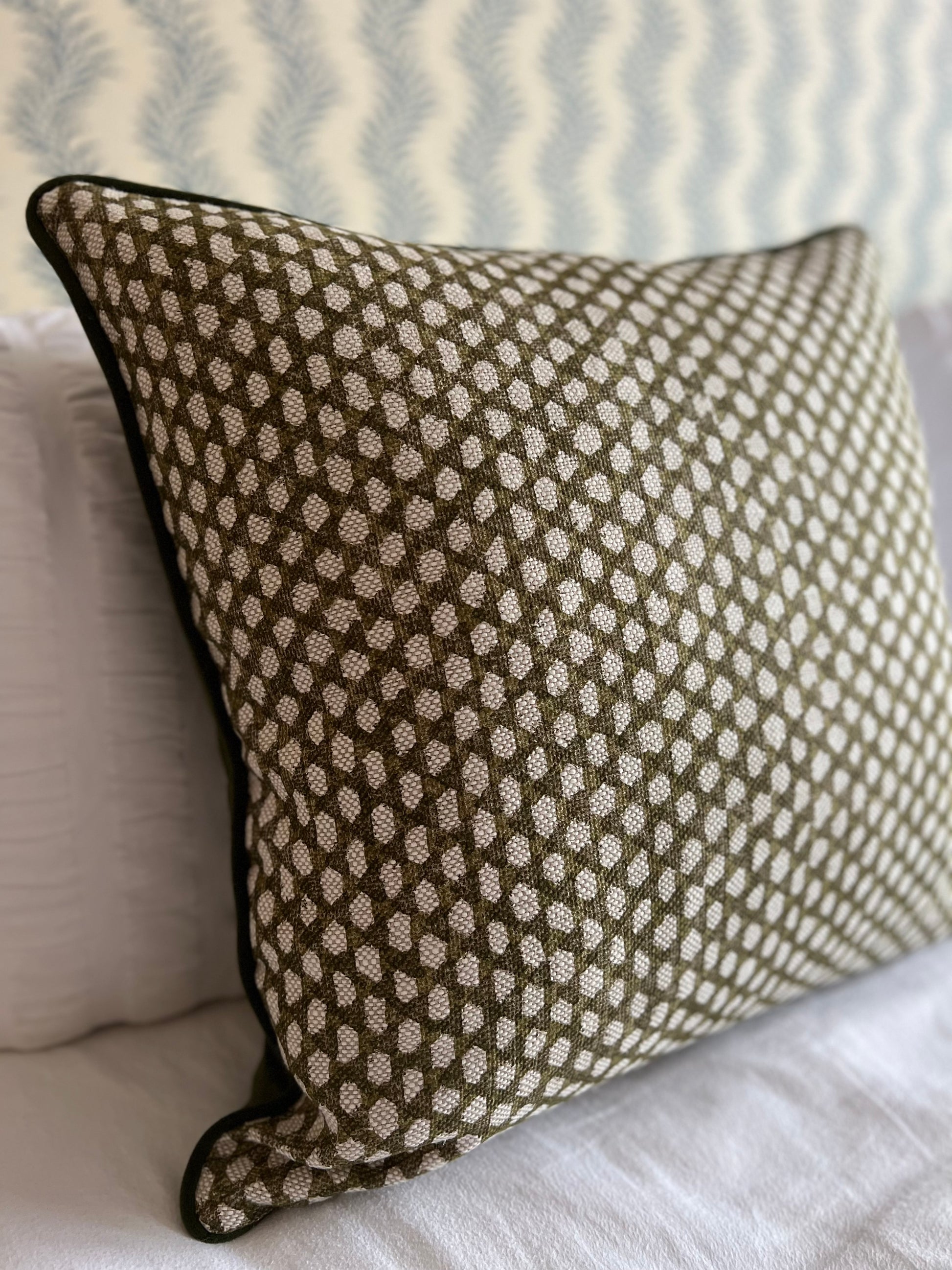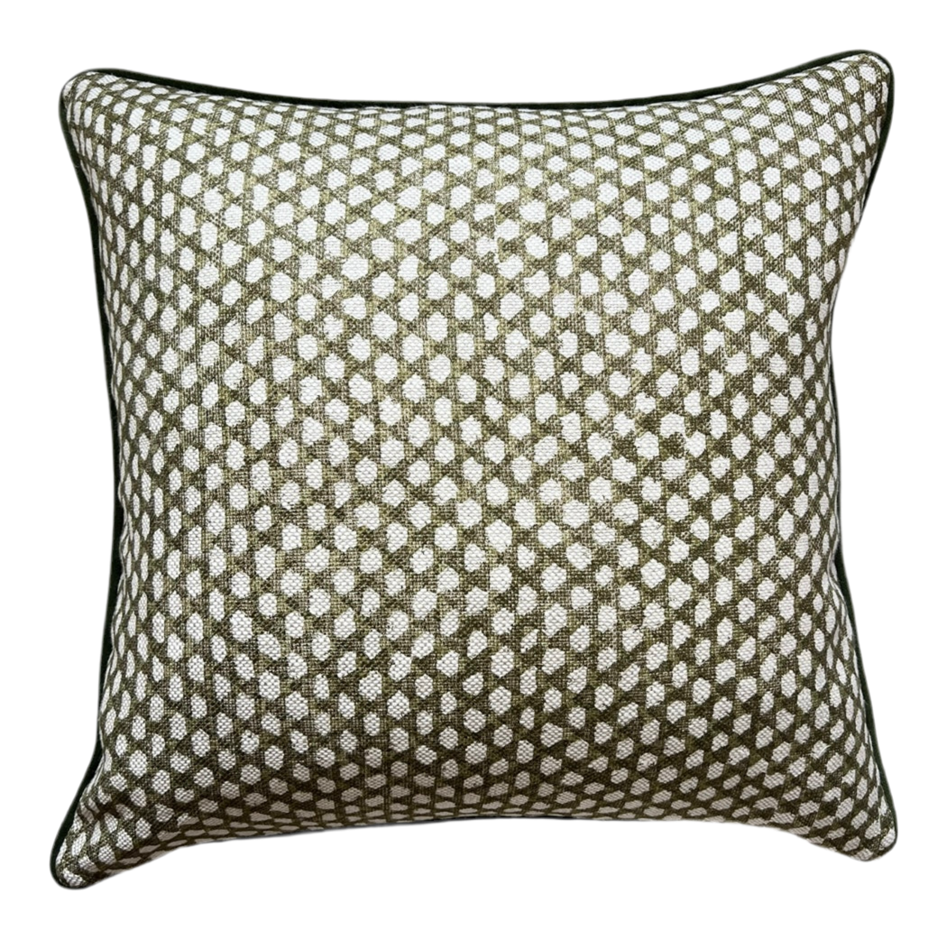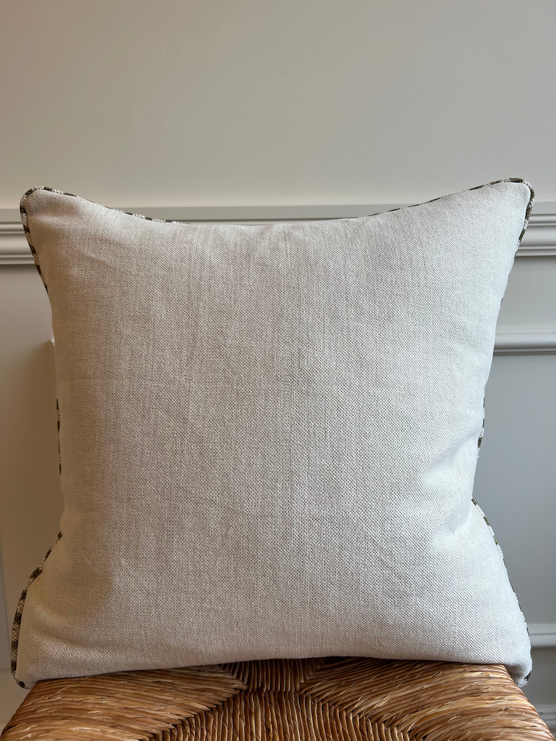Cushions in Fermoie Wicker fabric. N-114 colourway with a choice of trim and fabric for the back.