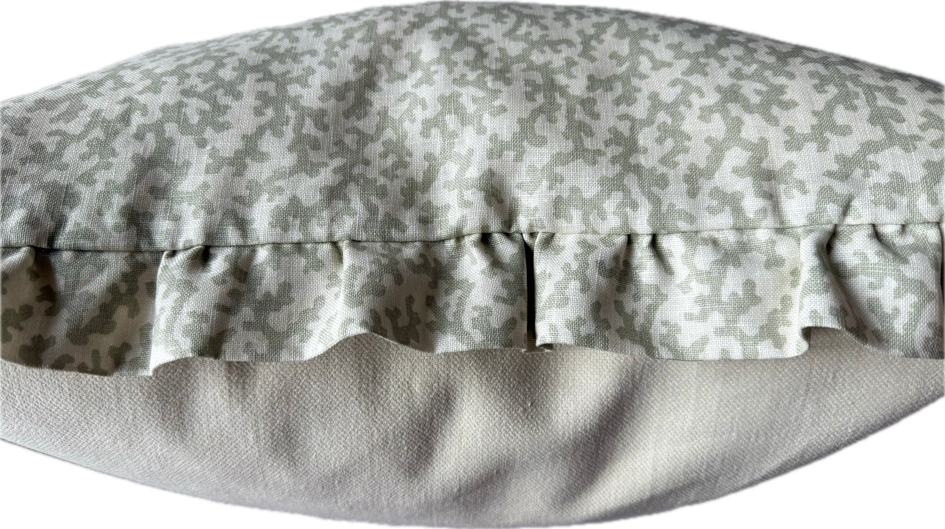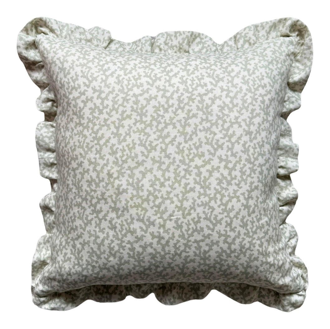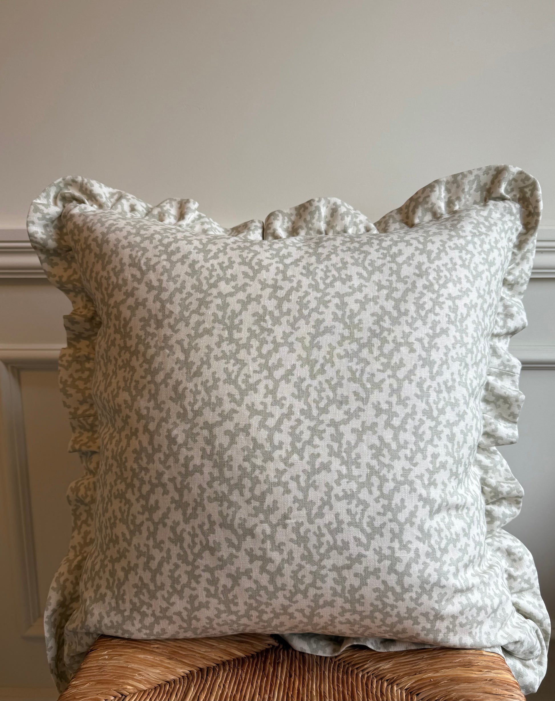 Cushions in Veere Grenney’s Folly fabric. Sage colourway with self-ruffle and cream linen back