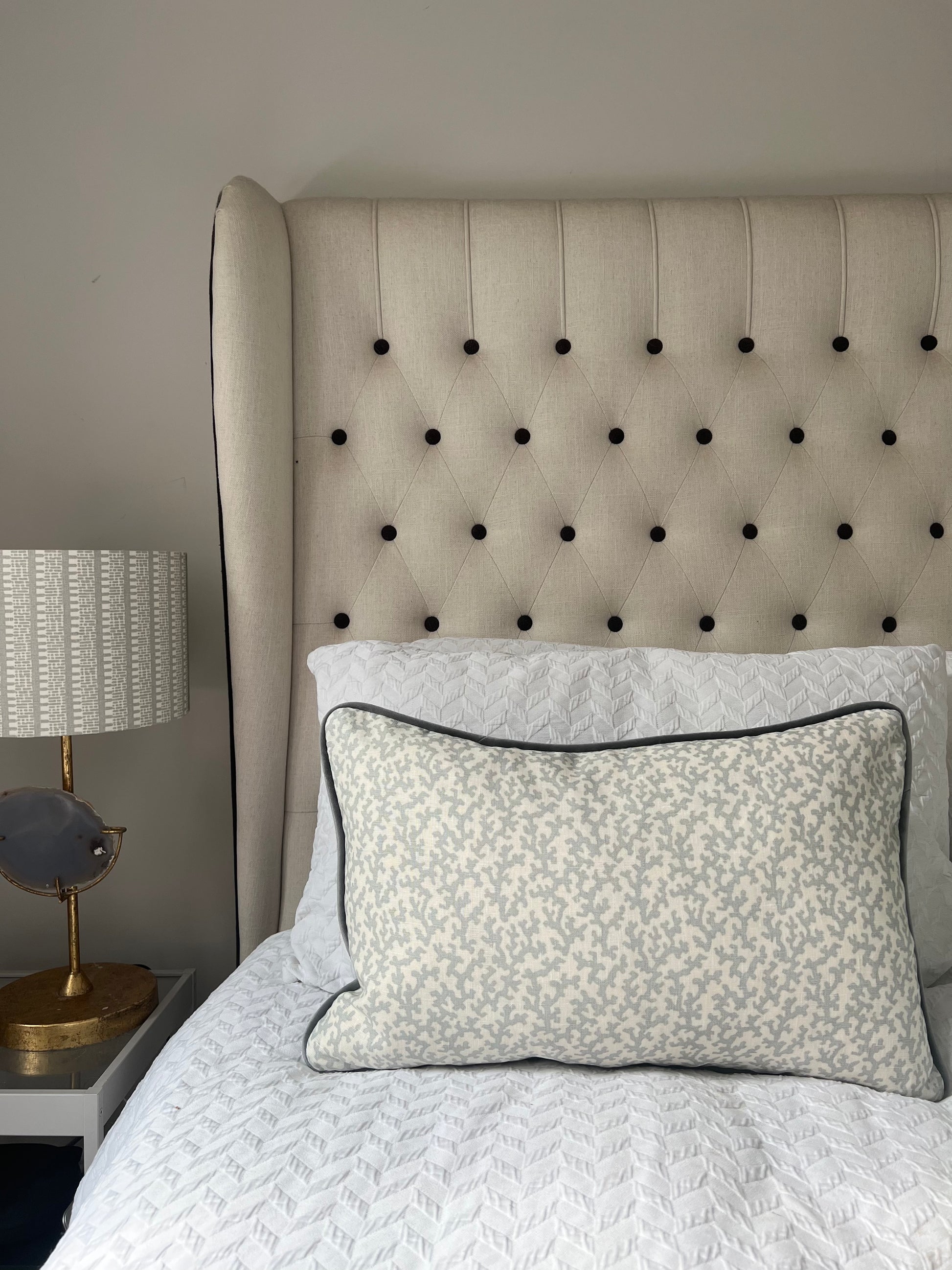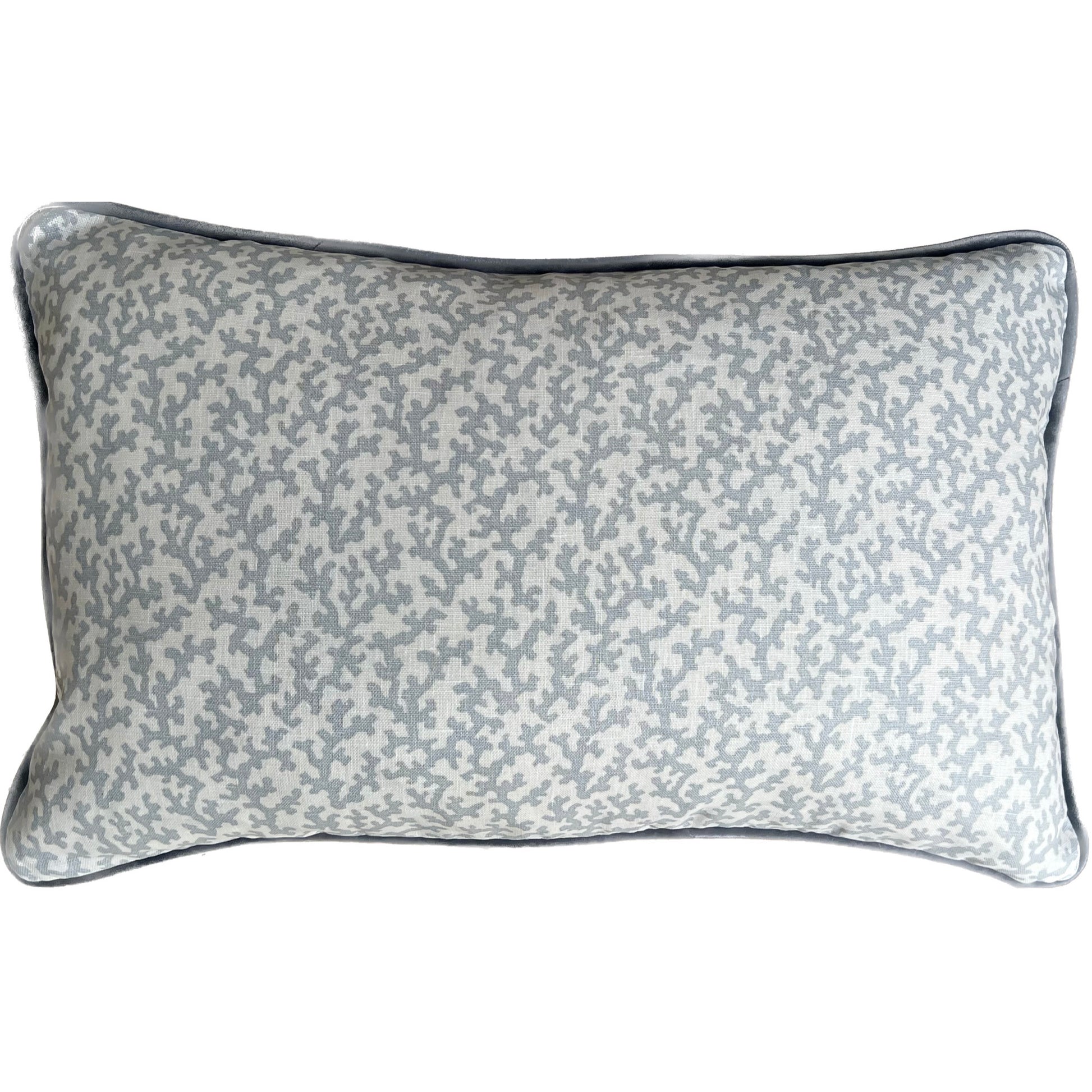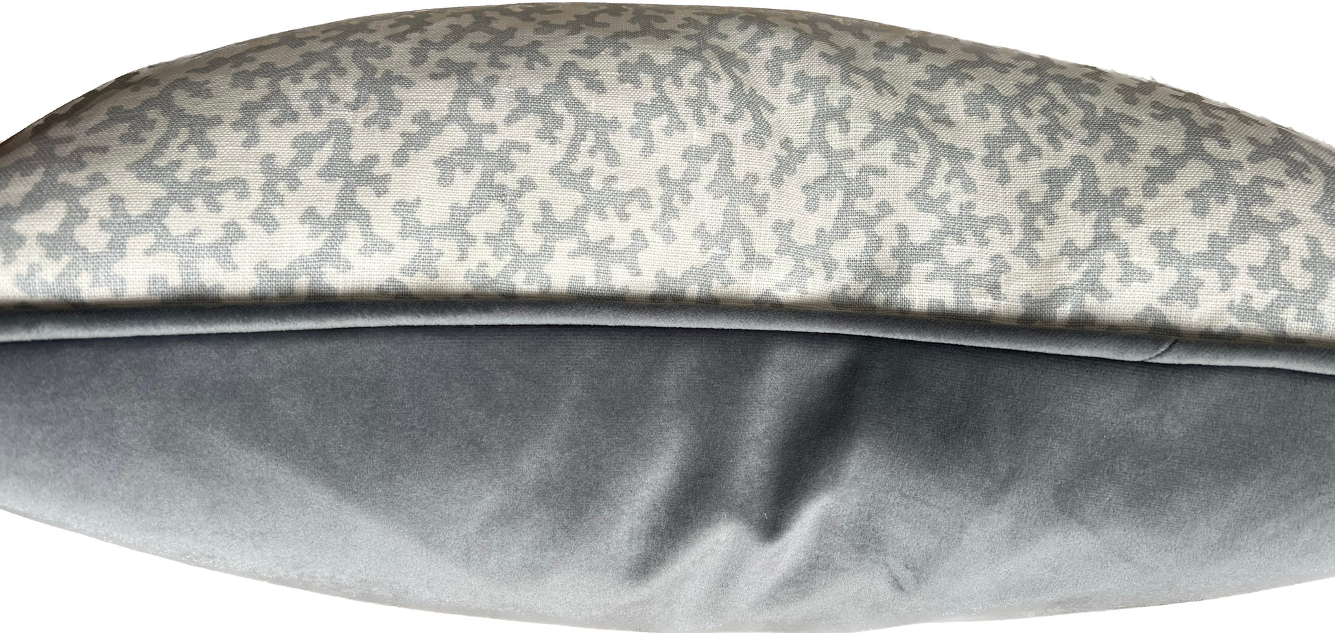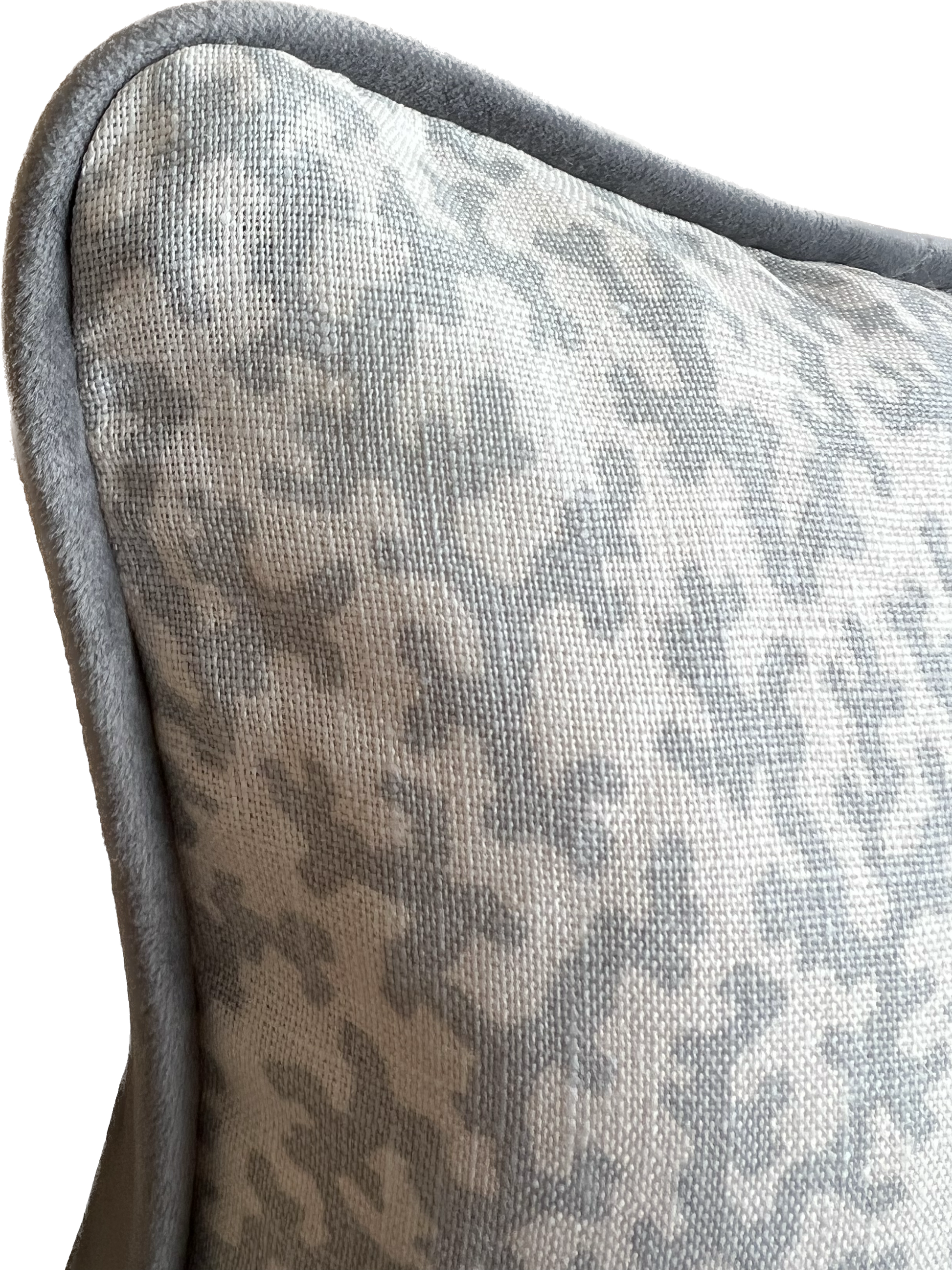 Cushions in Veere Grenney Folly fabric. Orpington Blue with velvet piping and backs and hidden zip in the seam