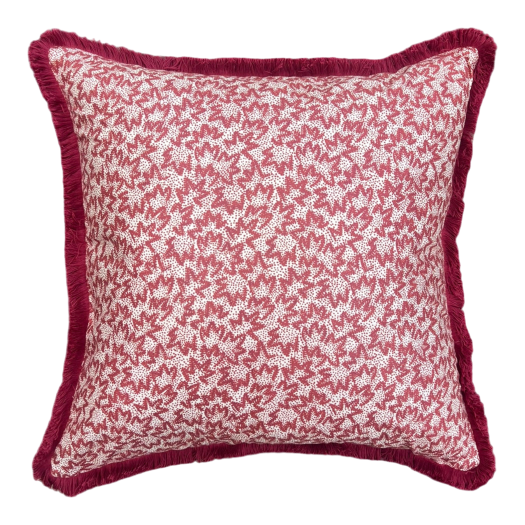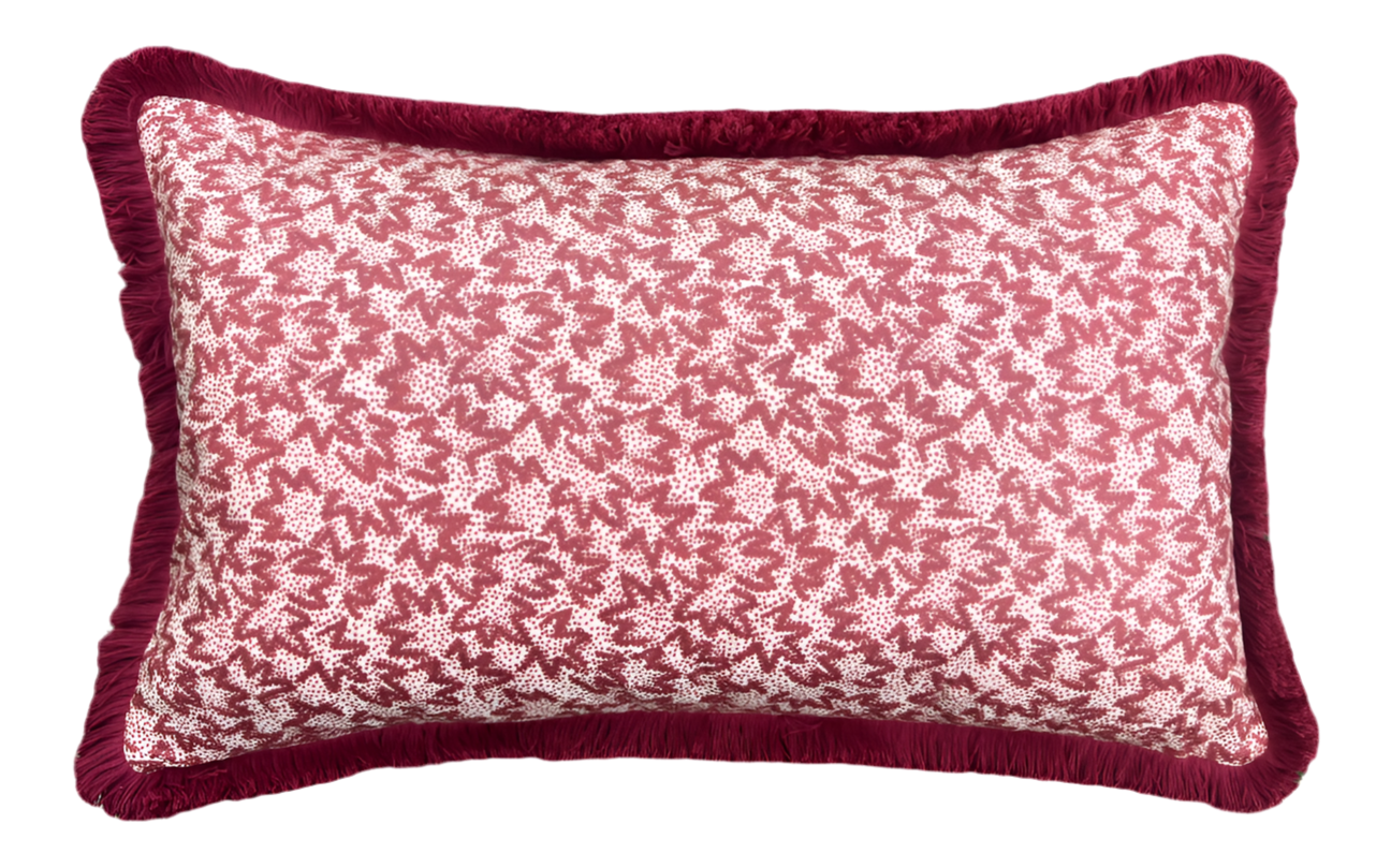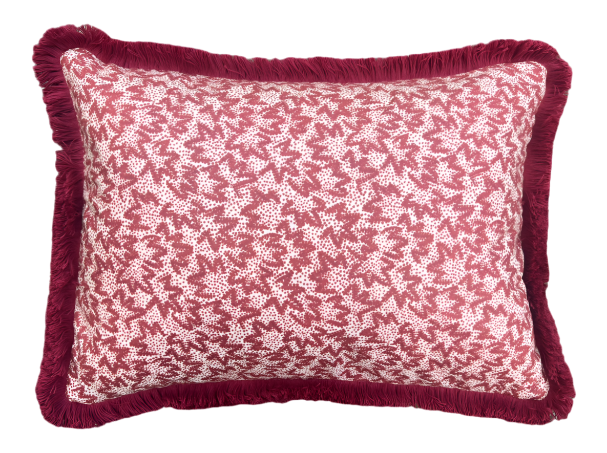 Cushions in Warner Textile Archive Nathalie fabric. Red colourway with a thick red fringe and soft red velvet back