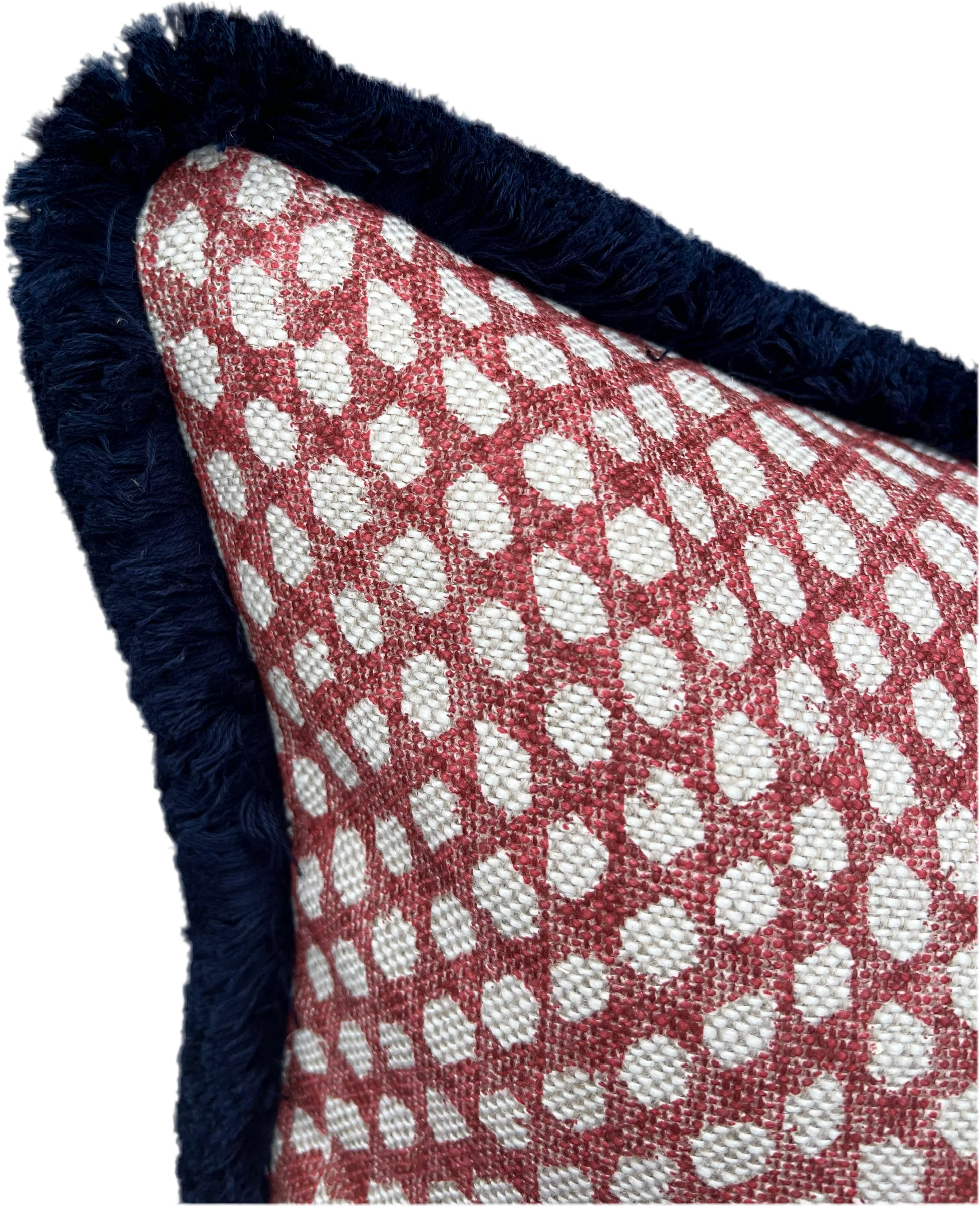 Cushions in Fermoie Wicker fabric. N-087 colourway with a thick, soft, navy fringe and neutral linen back